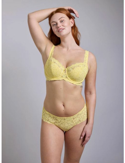 Bella Balconette in lemon merengue color. Softly padded balconette style with alluring italian lace for to brighten up your spring mood. Pick up Bella Hipster String or Tai High Waist to match with it.