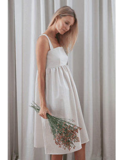 ALMA is a beautiful midi length cotton dress. The dress is light and therefore feels wonderful to wear. Wide, adjustable straps. Side pockets.