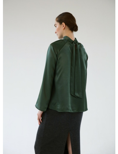 The EVE blouse has long, wide sleeves and a silklike feel. Bow detail in the back, high neck. This versatile blouse can be match together with a skirt, denim or trousers for a night out.