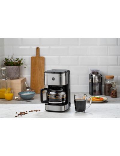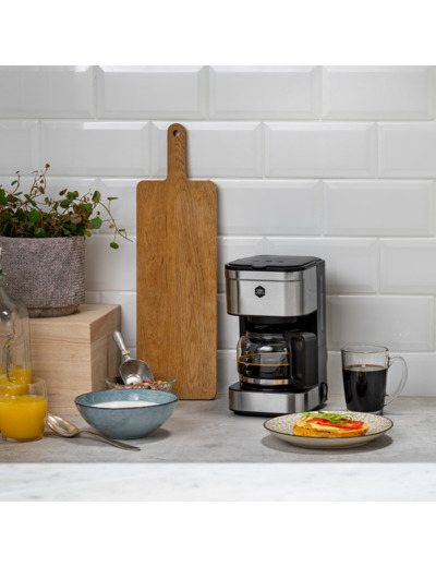 Coffee Prio - In the design of the coffee maker, classic black meets stylish stainless steel. It brews 6 cups of coffee and takes up minimal space in your kitchen. The Coffee Prio features a keep warm function and automatic shut-off after 40 minutes. The drip lock prevents coffee from dripping onto the warming plate when you remove the carafe. 700 W. Small coffee maker. Brews 6 cups of coffee.