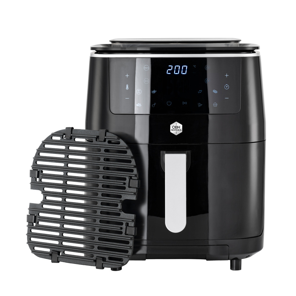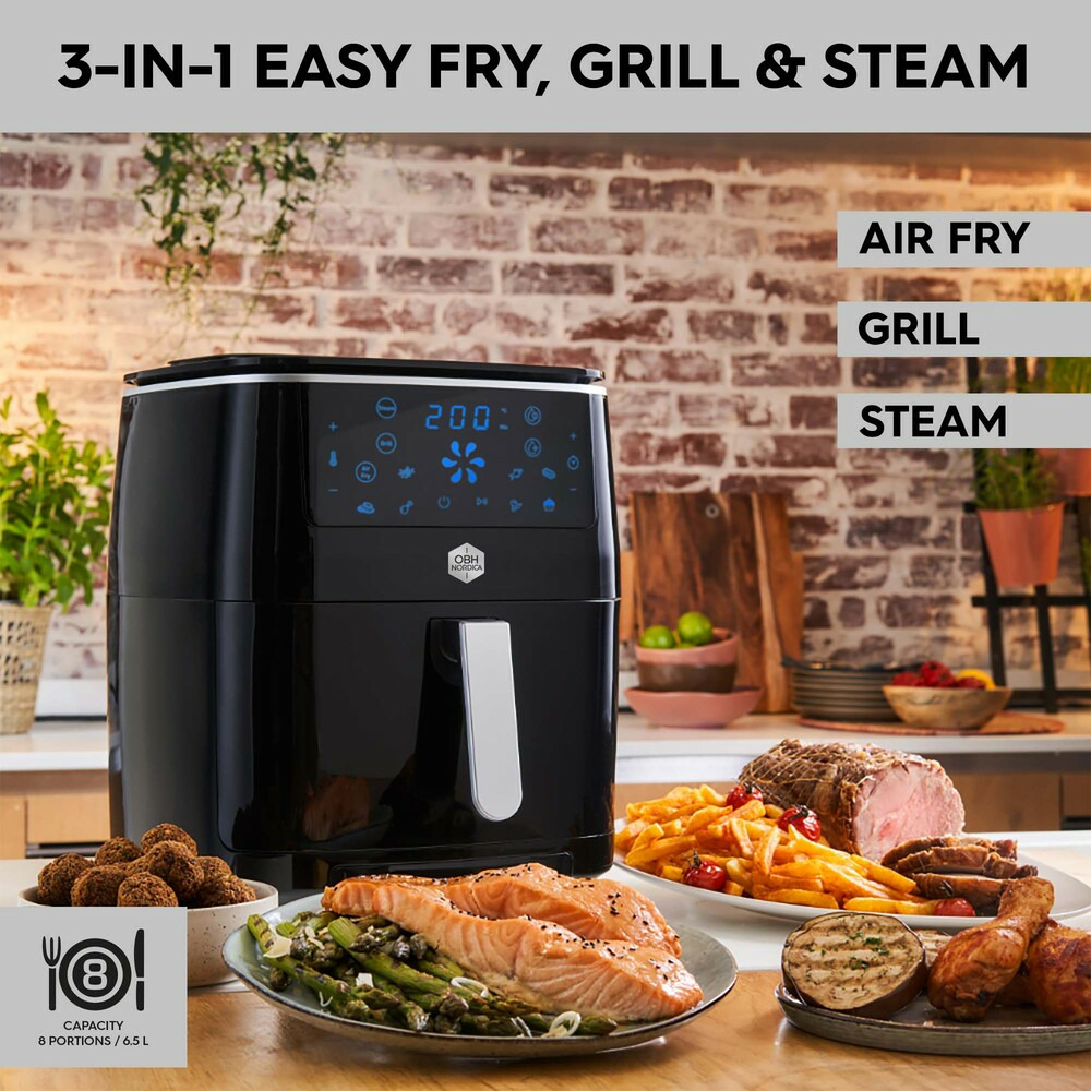 With a capacity of 6.5 liters, Easy Fry & Grill Steam + can prepare a meal for up to 8 people. The appliance features a 60-minute timer and an audible alert when the food is ready. The removable parts requiring cleaning are dishwasher-safe. Inspiring recipes can be found on our website at www.obhnordica.fi.