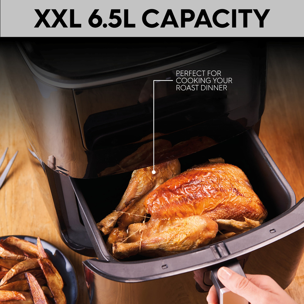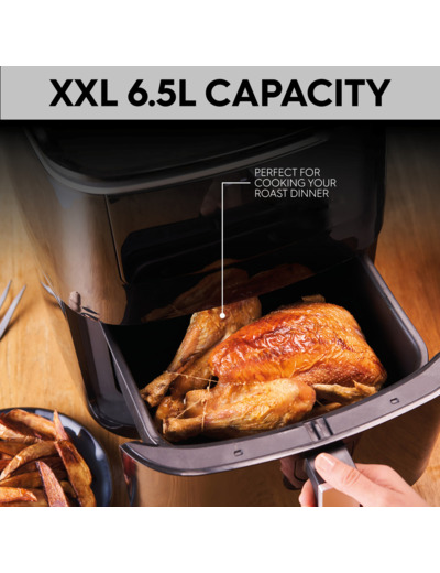Easy Fry & Grill Steam + cooks ingredients with circulating hot air, allowing you to create whole meals and delicious fried favorites with minimal or no oil. The hot and rapidly flowing air ensures that the food becomes crispy on the outside and juicy on the inside, similar to traditional frying but with almost no added fat. As up to 99% less fat* is needed in cooking, this air fryer is particularly suitable for health-conscious cooks.