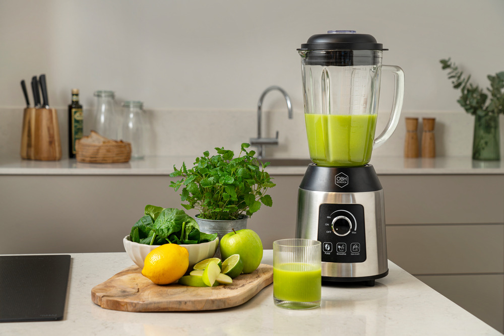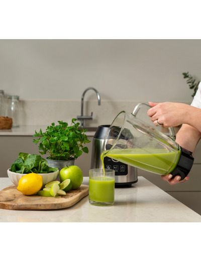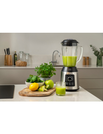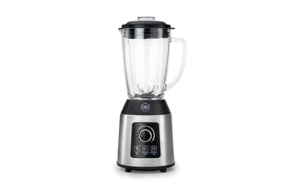 With the stepless controller, you can easily set your desired blending speed. The powerful 1,000 W motor in the Sharp Mix blender can effectively blend your smoothies with ice. The 1.8-liter glass jug of this blender can withstand hot liquids up to 50°C.