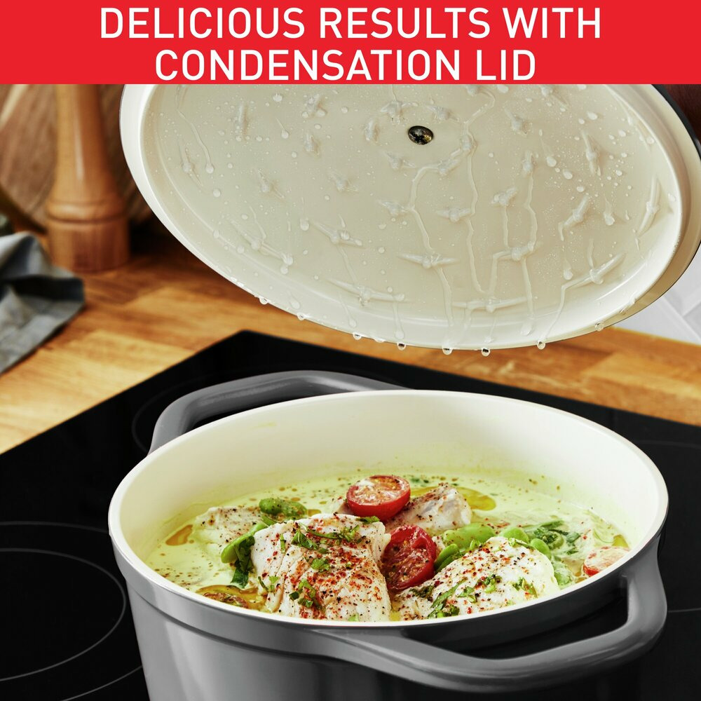 The Tefal Air pot combines all the benefits of a cast iron pot, but in a lightweight and modern design. Made from cast aluminum, this pot weighs only a third of traditional cast iron pots. The Tefal Air pot is perfect for cooking succulent stews, Sunday roasts, pulled pork, or soups. Additionally, the pot is easy to clean thanks to its ceramic coating and is dishwasher safe. The Tefal Air pot comes with a condensation lid, featuring small bumps that promote water circulation and make dishes tender and juicy. Suitable for all stovetops - ceramic, gas, electric, and induction. Furthermore, the pot is oven-safe, making it ideal for preparing pulled pork or Sunday roasts. Despite being lightweight, the pot's thick and sturdy aluminum construction ensures durability for everyday use. 3x lighter than traditional cast iron pots Condensation lid
