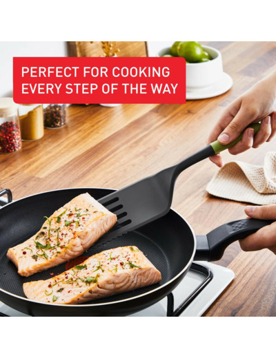 The Essential 2in1 is an extremely long spatula that can be used for flipping, stirring, and serving. It features a cutting edge that is perfect for slicing dishes such as lasagna, omelettes, or pies. This spatula is safe to use in all types of cookware and serving dishes - even those with non-stick coatings. These kitchen utensils can withstand heat up to 230°C. Additionally, they are easy to clean in the dishwasher. Extremely long spatula with cutting edge 2-in-1 feature