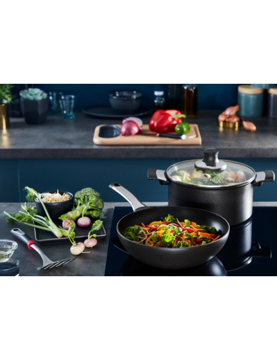 No scratches, no dents, no burnt-on food. The sturdy Tefal Excellence frying pans are built to withstand tough and long-term use, ensuring that your kitchen equipment is always in top condition. The new titanium scratch-resistant and non-stick coating, developed over years of research, lasts six times longer than Tefal's standard coatings. The innovative Thermo-Signal™ heat indicator changes color when the pan reaches the ideal cooking temperature (approximately +180°C). The wok pan is the ideal choice for preparing quickly cooked Asian dishes. It features a redesigned thick Thermo-Fusion™ induction base, providing a wider induction area for rapid and even heat distribution. The robust handle, with its polished stainless steel detail, completes the design. Suitable for all stovetops. Oven safe up to +175°C. Safe to use. Made in France. Made in France Titanium scratch-resistant: 6x more durable than conventional coating.