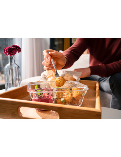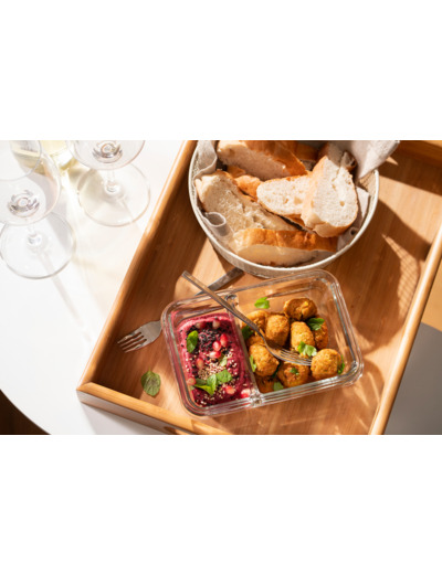 The glass Tefal MasterSeal GLASS storage container is a durable choice. Thanks to its unique lid seal, food stays fresh and crisp for longer. Completely leak-proof, this storage container is suitable for liquids and transporting food. It is also odorless and hygienic, making it perfect for baby food as well. The storage container is made of oven-safe borosilicate glass, which can withstand heat and protect against color fading and odor absorption. It is oven-safe up to 420°C (without the lid). The MasterSeal GLASS storage container can also be used in the microwave, dishwasher, and freezer. The rectangular container has a volume of 0.8 liters.