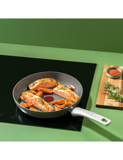Less environmental impact, more good food! Tefal's (RE)NEW ON features an innovation in ceramic-coated cooking and frying utensils for preparing food in a whole new way. Made in France from materials with lower environmental impact than usual. The product's aluminum body is made from 100% recycled material*, resulting in a smaller environmental footprint. The safe and durable ceramic non-stick coating prevents food from sticking to the pan during cooking, even when using little or no oil. Perfect for preparing fresh and healthy meals. (RE)NEW ON is also compatible with all types of stovetops, including induction. It includes an intelligent Thermo-Signal™ temperature indicator that changes color when the temperature is perfect to start cooking. (RE)NEW ON does not compromise on non-stick properties or ease of use, making both cleaning the utensil and preparing delicious food easy.
