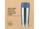 Travel Mug ECO is a 0.36-liter thermos mug, made of 90% recycled stainless steel. Keeping drinks hot for up to 4 hours and cold for up to 8 hours, it is perfect for on-the-go and desk use. This model features a new improved twist cap with a button on the top for easy opening and drinking. The cap is completely leak-proof, so you don't have to worry about spills in your bag. Additionally, the thermos cup fits perfectly in a car cup holder. It is dishwasher safe and easy to clean, as the cap can be easily disassembled into two parts for thorough cleaning. 90% of the material is recycled stainless steel Completely leak-proof