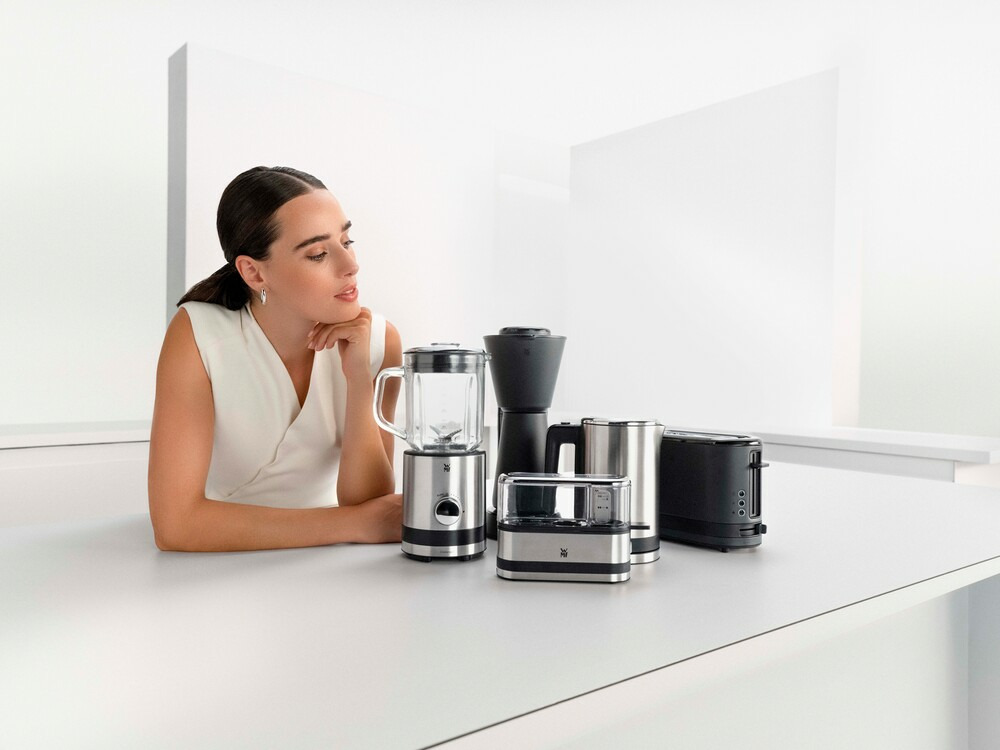 The smallest Cromargan® blender makes an impression with its powerful motor: 400 watts, 20,000 rotations/min, 241 km/h. With five speed settings, there is a suitable speed for every need. It also features a pulse function. Thanks to WMF Perfect Cut, the blender has 6 double-sided blades made of stainless steel. The removable 0.8-liter glass jug comes with a practical lid with a filling hole. The included dosing cup makes usage easier. Rubber feet ensure that the blender stays securely in place. 400 watts, 20,000 rotations/min, 241 km/h. Five speed settings.