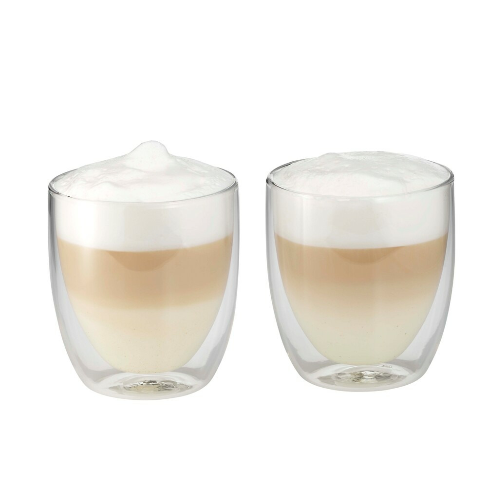 The WMF Kult Collection is a series of high-quality borosilicate glasses that represent the perfect balance of functionality and design. The double-walled thermal glass structure keeps hot and cold contents at the right temperature for longer and prevents condensation. The outer surface of the double-walled glass keeps the temperature neutral regardless of whether the drink is hot or cold. This means you won't burn your fingers, allowing you to enjoy a delicious hot drink in a stylish handle-less glass that also won't leave unsightly rings on tables or other surfaces due to its neutral outer temperature. When the glass is empty, you can wash it in the dishwasher and continue your day as you please. This set includes two glasses.