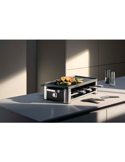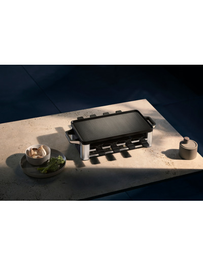 Golden yellow melted cheese, small bites, and grilled delicacies. With the WMF Lono raclette grill, food is prepared leisurely while socializing with friends. It is easy and fun to host gatherings for up to eight people and enjoy a variety of raclette flavors. The beauty of a raclette evening is that everyone creates their own meal. This way, food preparation doesn't take hours and the hosts can relax with friends. Vegetables, meats such as steaks and skewers, sausages, and seafood can be cooked on the non-stick grilling plate. Cheese is melted in the individual pans. The best results are achieved with actual raclette cheeses. Delicious options include cheddar, gouda, mozzarella, feta, and blue cheese as seasoning. The cheese is allowed to melt in the pan until bubbly and golden yellow. The melted cheese is then transferred to a plate or on top of accompaniments using a spatula. The cheese doesn't stick, but easily slides out of the coated pans. Melted cheese pairs well with items such as broccoli, sliced onions, baked potatoes, boiled potatoes, tomatoes, mushrooms, pickles, cocktail onions, ham, salami, or cocktail sausages. The pans can also be used to gratinate vegetables with cheese. Foods cooked on the grilling plate can also be gratinated in the pans. Let your imagination run wild! The set includes eight non-stick pans and spatulas, which are dishwasher safe. The reversible grilling plate also functions as a pancake griddle. One side of the reversible and non-stick grilling plate features grill lines for grilling, while the other side has two depressions for making pancakes. The WMF Lono raclette grill can thus be used as a pancake griddle. Power: 1,500 W. Accessories included: reversible grilling plate, 8 pans (8.3 x 10 cm), 8 spatulas. Reversible grilling plate: for grilling and making 2 pancakes, non-stick coated. Non-stick coated pans and spatulas are dishwasher safe. Adjustable temperature. Convenient storage space in the frame for hot unused pans. Frame made of high-quality Cromargan® 18/10 stainless steel. Dimensions (LxWxH): 54.5 x 24.1 x 13 cm. Weight: 4.9 kg. Cord length: 2 m