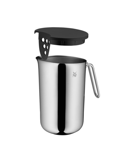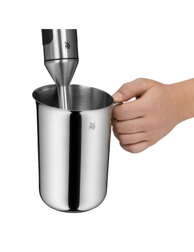 Practical kitchen essential. WMF has reimagined the stainless steel mixing bowl with a perfect practical touch! From soups and smoothies to delicious homemade purees - the WMF Hand Blender Bowl features an ideal shape and height for use with a hand blender. It also offers drip-free pouring, keeping your kitchen clean. The handle ensures a safe, secure grip, while the interior measurement markings help achieve precise results. The set is completed with a detachable lid featuring an integrated sieve for easy straining of larger pieces. The sturdy bowl, made of high-quality stainless Cromargan® steel, has a shiny exterior and a matte interior. It is dishwasher safe, allowing for effortless cleaning.
