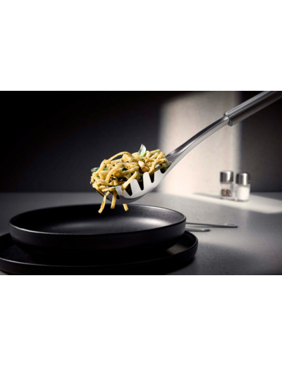 WMF offers high-quality, functional, and beautiful products for everyday use and special occasions that meet the highest design standards! The WMF Profi Plus pasta server features spikes surrounding the deep well, making it the perfect tool for serving pasta. Long noodles, spaghetti, and ribbon-like pasta easily cling to the long spikes, allowing for easy transfer from pot to serving dish or plate. Any excess water drains automatically through a small hole in the server. The WMF Profi Plus pasta server is also suitable for other types of pasta. The wide server can hold smaller macaroni and pastas such as penne and farfalle, making it easy to neatly portion them onto a plate. This 32 cm long pasta server, made from high-quality Cromargan® stainless steel, is an indispensable tool for any kitchen. The WMF Profi Plus series offers a range of compatible, practical kitchen tools for food preparation. All Profi Plus kitchen tools are highly durable and can withstand daily use. They can also be cleaned in the dishwasher for easy maintenance. Each kitchen tool features a small stainless steel hanging loop for convenient storage within reach. When the material used for the product must be high-quality, durable, and maintain its shine year after year, the natural choice is WMF's stainless Cromargan® 18/10 steel. Cromargan® is a registered trademark that ensures WMF's Cromargan® steel stands out from other stainless steels. Its manufacturing processes are efficient and high-quality. The quality of Cromargan® steel is closely and regularly monitored to consistently meet the required standards for the products made from it. Additionally, Cromargan® steel is highly resistant to scratches and wear, completely rust-resistant, does not retain flavors, and withstands food acids. Cromargan® steel is manufactured in Germany. WMF is one of the world's leading manufacturers of stainless steel products and has been producing high-quality and practical kitchen and household items since 1853. WMF has won numerous international design awards for both product design and functionality, especially in relation to frying pans, pots, and Cromargan® steel production. The range includes cookware, knives, utensils, and various electrical appliances. Special design and sieve holes for easy pasta serving. Made from high-quality stainless Cromargan® steel.
