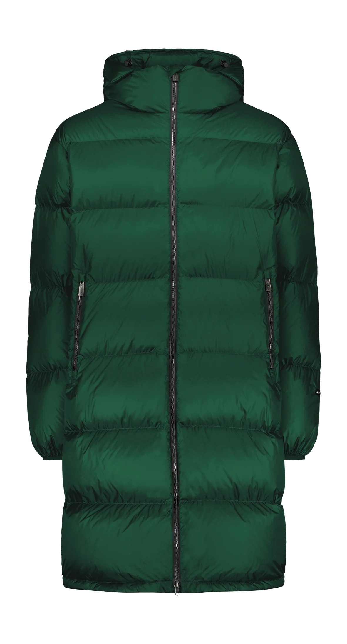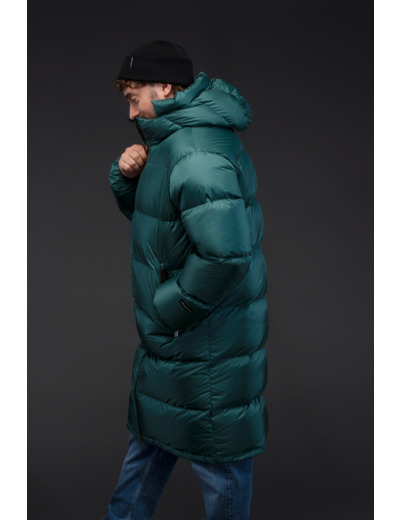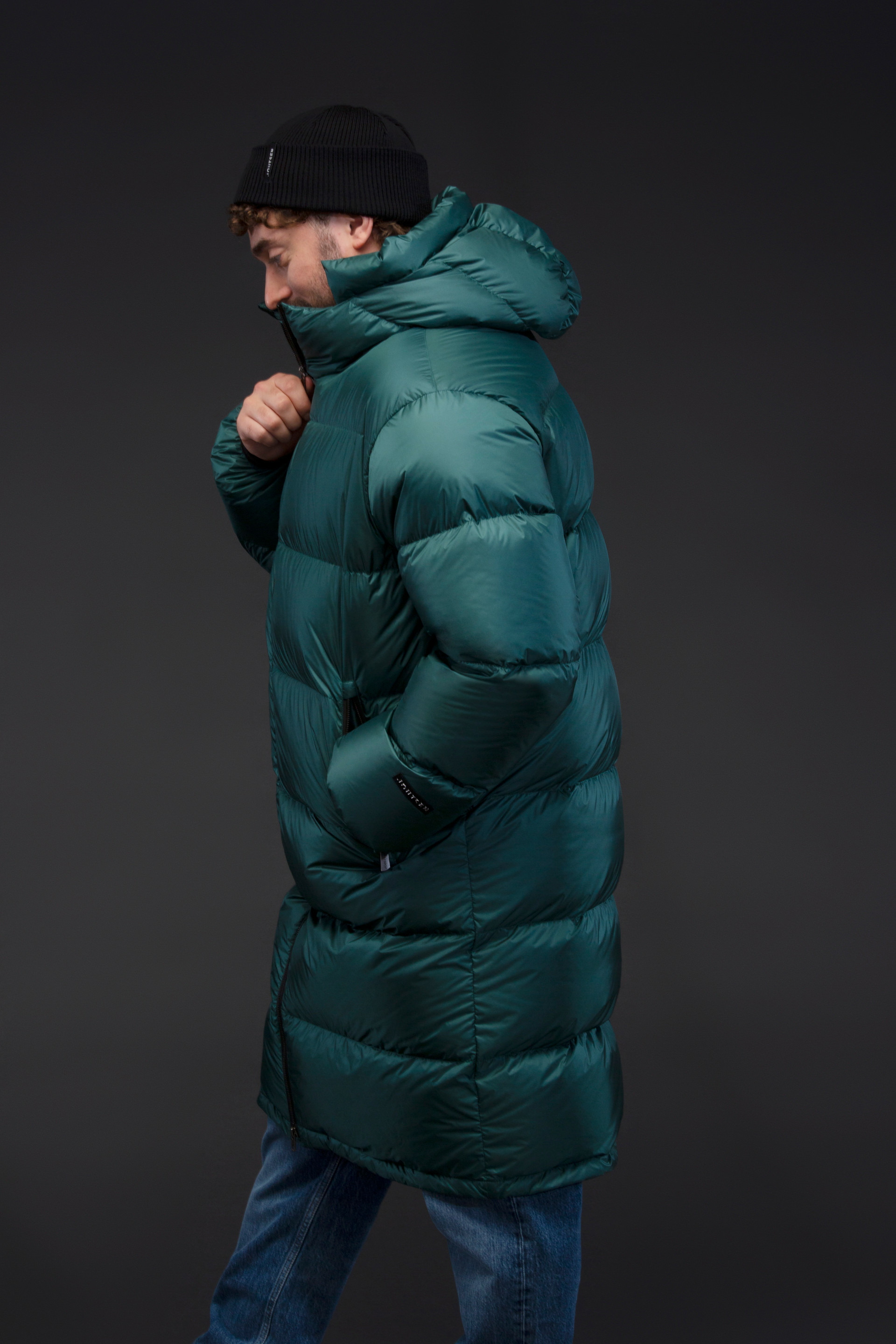 Knut is a long men's down coat that combines comfort, style, and functionality. The coat has a generously large hood with a very protective storm edge. In the front piece's zippered front pockets and large inner pockets, there's plenty of space for a phone, gloves, and other essential items. Knut is made from a durable and lightweight fabric that repels water and resists the wind very well. The coat's filling is 100 percent responsibly produced and scientifically tested pure down.