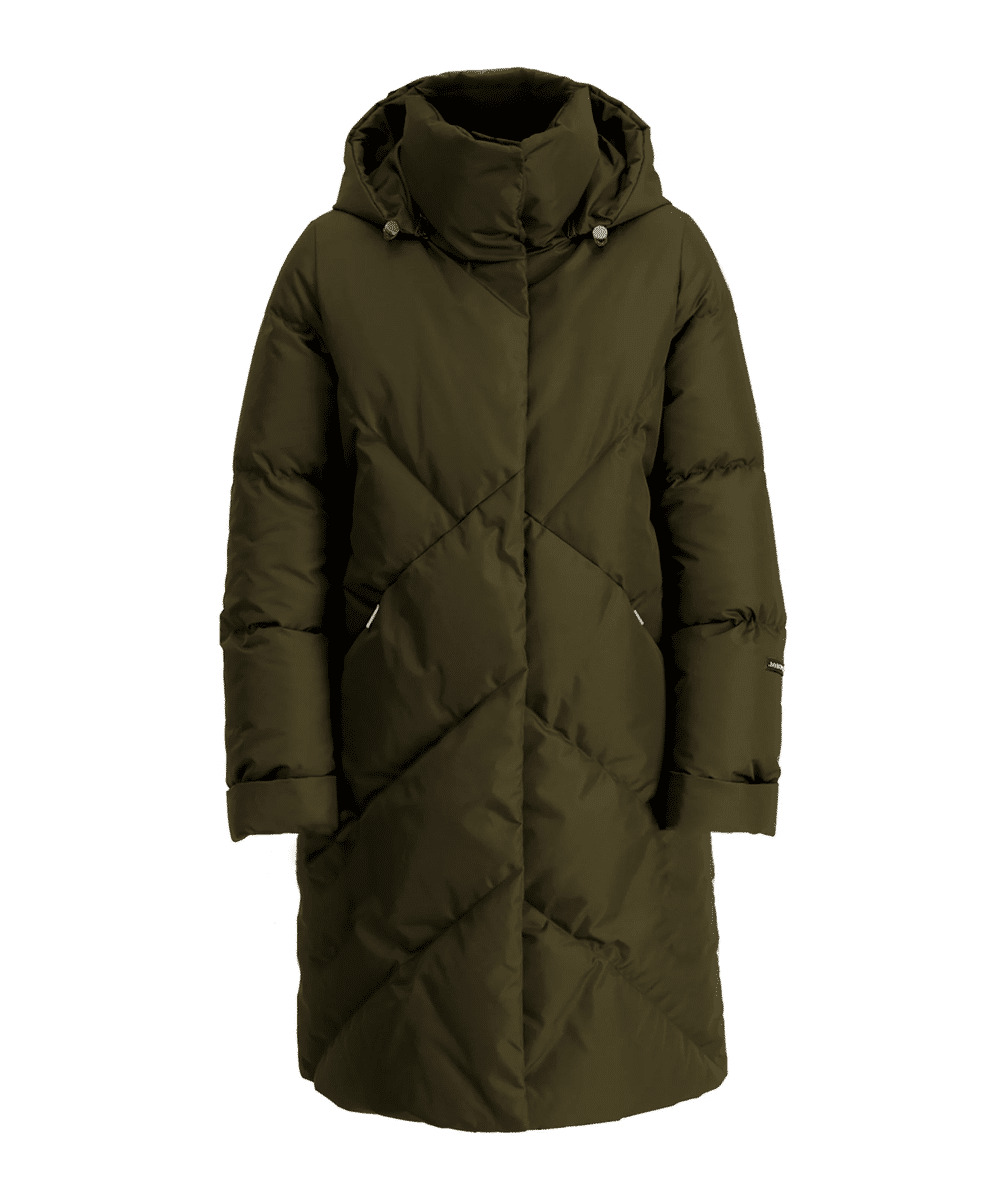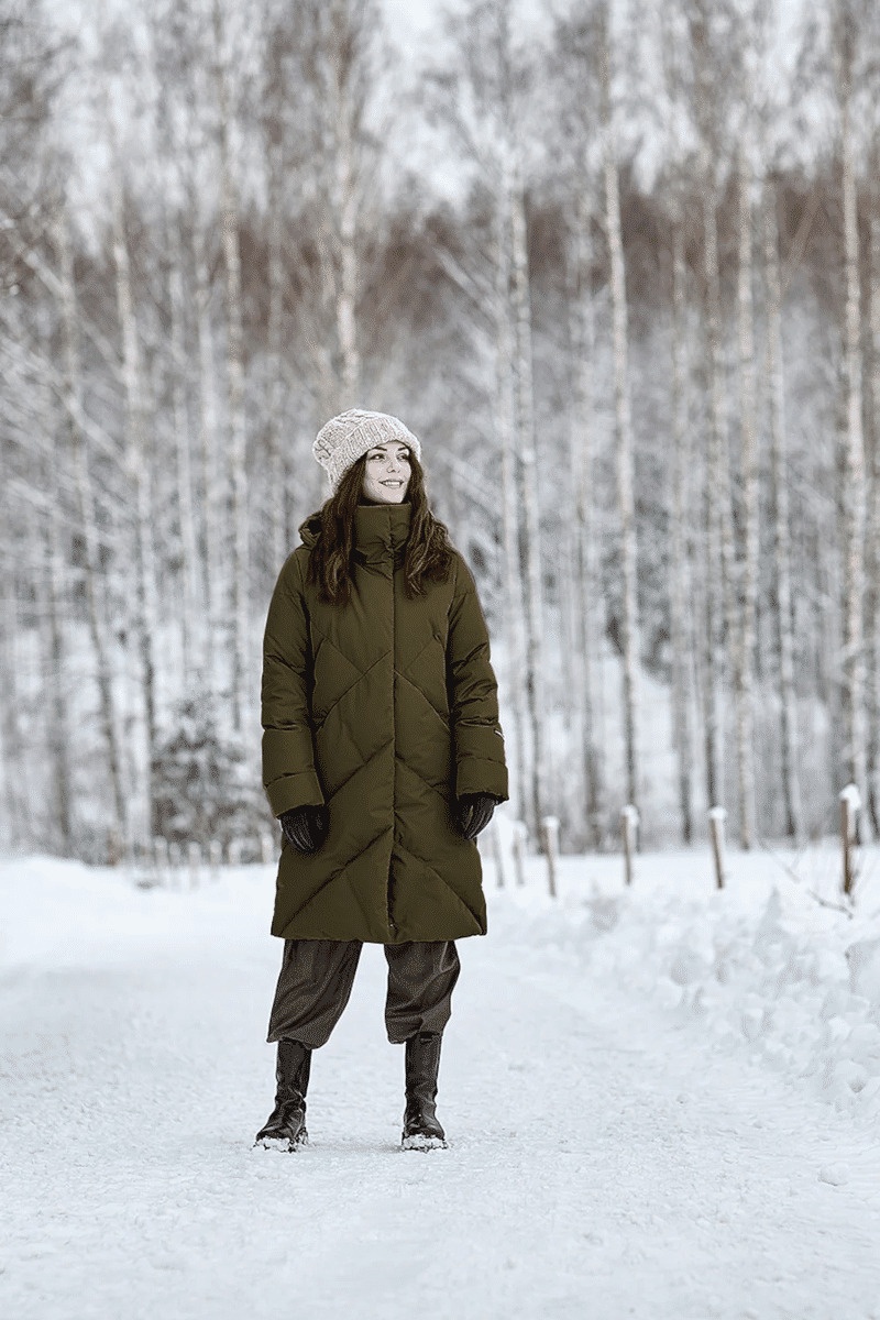 Laulu is a beautiful, diagonally quilted and fitted down coat with a protective stand-up collar and detachable hood. This knee-length down coat keeps you warm and protected, even in harsher snowstorms and freezing temperatures.