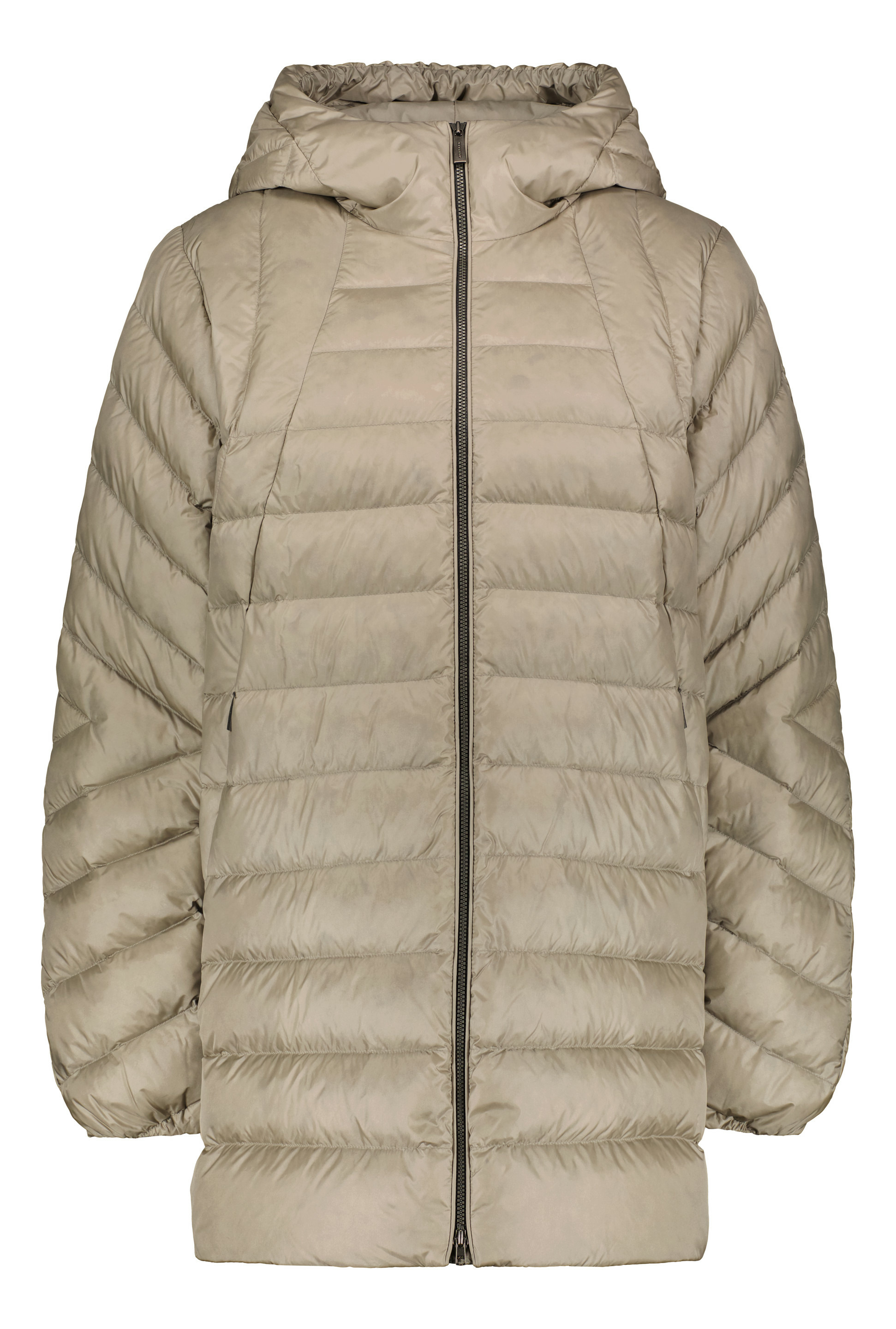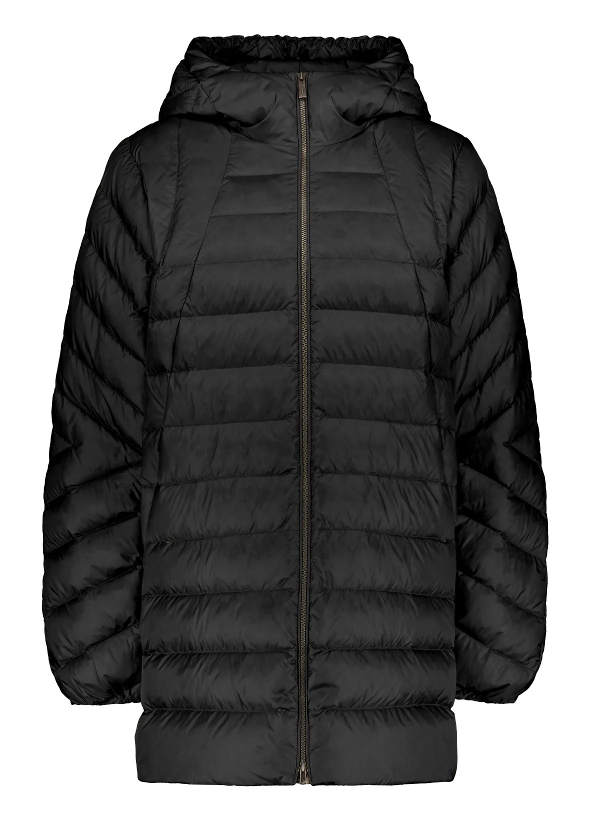 The Orvokki light down coat features wonderfully quilted, spacious, and baggy sleeves with comfortable rubber band tightening at the cuffs. It has enough room for a thicker sweater to be worn comfortably underneath. The fixed hood is designed to sit nicely on the neck when down or can be folded into a protective collar. The coat has a straight design but is roomy at the top. The hem can be adjusted to be baggy with the help of a drawstring. The Orvokki coat is versatile, suitable for everyday wear and outdoor activities, yet its striking details make it ideal for evening outings and as part of a more festive outfit. Colors: black and champagne