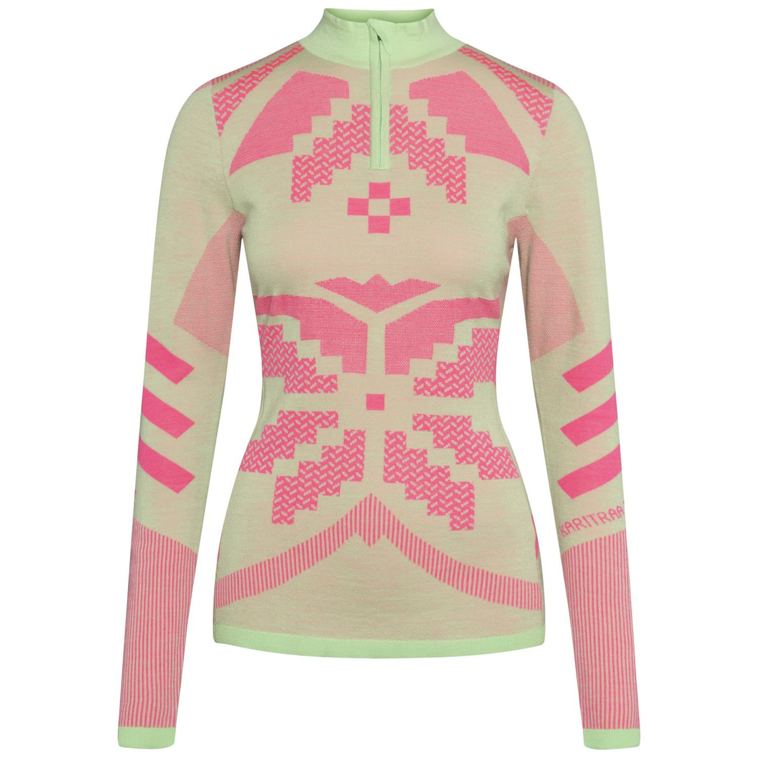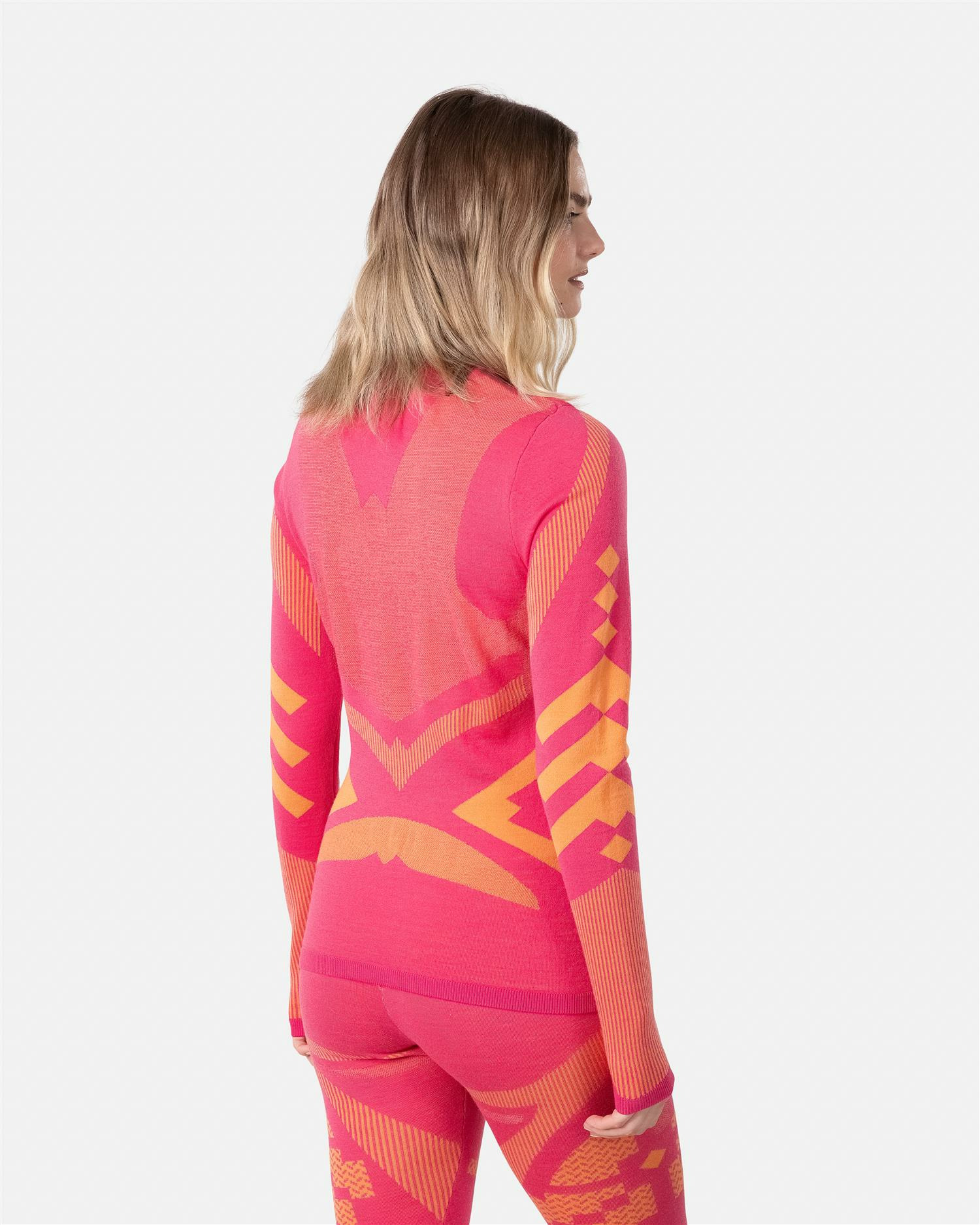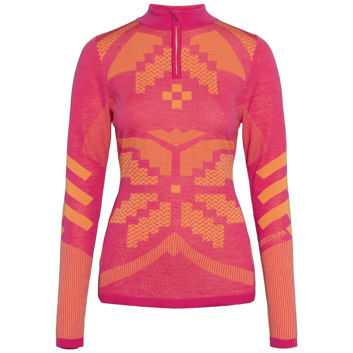 Meet the Kari Traa Faith Half Zip, a 100% Merino wool performance layer featuring our Female First body mapping technology. This semi-seamless top integrates supportive structure and ventilation where you need it: under arms, breast area, and back. With the eye-popping oversized Rose pattern, the Faith is for hard charging women who want to look as good as they perform