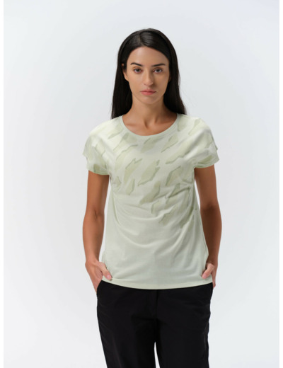 Icepeak t-shirt for women. Loose fit. Short sleeves. Round neckline. Printed pattern. Contains recycled materials. The fabric quickly wicks moisture away, keeping the skin dry and feeling comfortable.