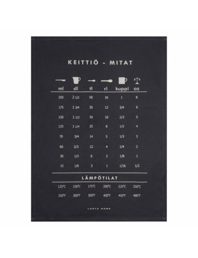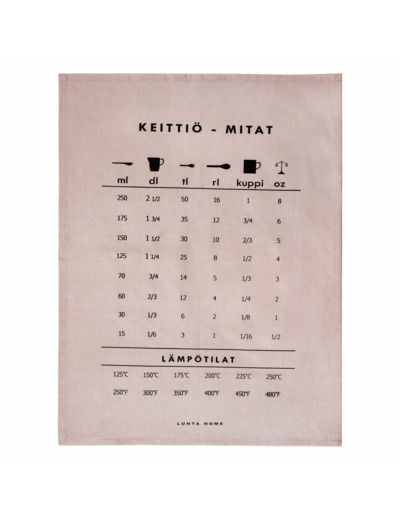 The Liitu kitchen towel is made of 100% organic cotton. The cotton is pleasantly soft and a very absorbent material. The towel has printed kitchen measurements converted into different measurement units used in various nationalities. It is easy for you to check how much the recipe's Fahrenheit temperature is in Celsius or how much 1 cup is in deciliters.