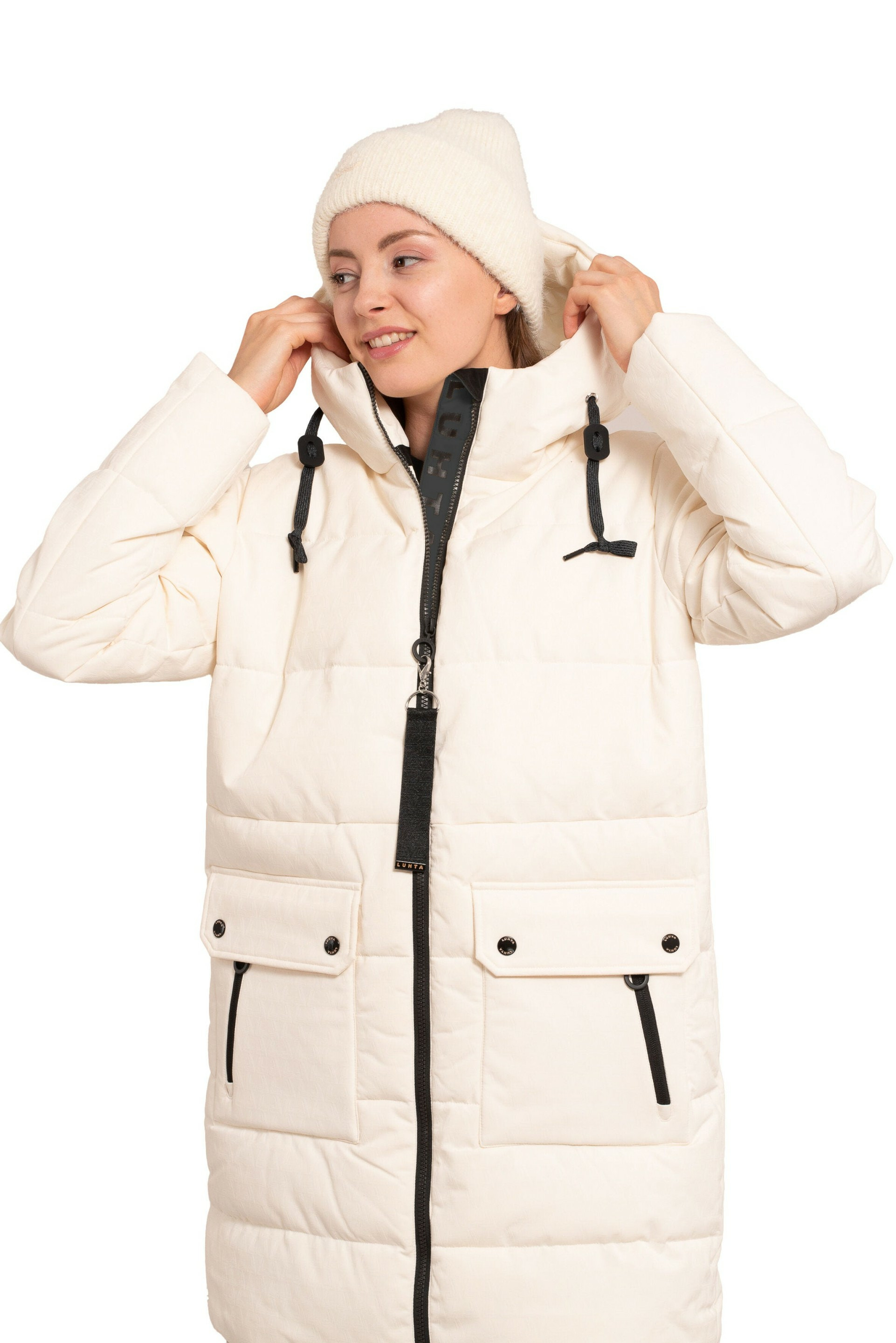 A warm, covering jacket from Luhta with a water-repellent surface that has a subtle pattern. The stylish padded jacket features a fixed hood with drawstrings, and the sleeves have elastic inner cuffs. In the front, there are two spacious flap pockets with snap fasteners, as well as lined pockets for warming hands. Inside, there is one zippered pocket. The front zipper opens in two directions, and its pull has a removable decoration. There is an adjustable feature at the waist. The jacket's padding is down imitation, but it provides good thermal insulation and feels lightweight. The lining is made of polyester. A good-looking winter jacket for movement and everyday activities.