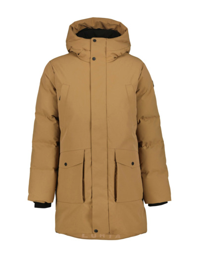 Luhta long padded jacket for men. Adjustable fixed hood. Elastic cuffs on the inside. Two zippered front pockets. Two buttoned front pockets. Zippered inner pocket. Slip pocket. Two-way zipper in the front. Double wind flap with snaps. Logo label. Logo print. Water column 5,000 mm. Breathability 5,000 g/m²/24h. A.W.S. ACTIVE product design has focused on functionality and comfort, making it suitable for both active and relaxed movement. The padding is down imitation, providing effective thermal insulation while feeling lightweight. The water-repellent treatment is done without fluorocarbons. The fabric surface is treated to be water-repellent. Windproof material keeps you warm. Polyester lining. Really warm padding.