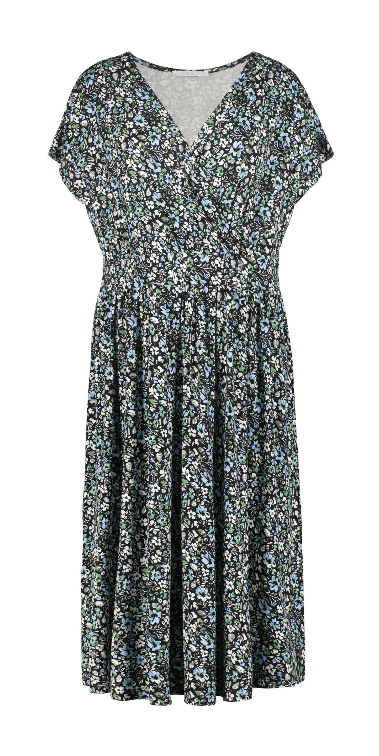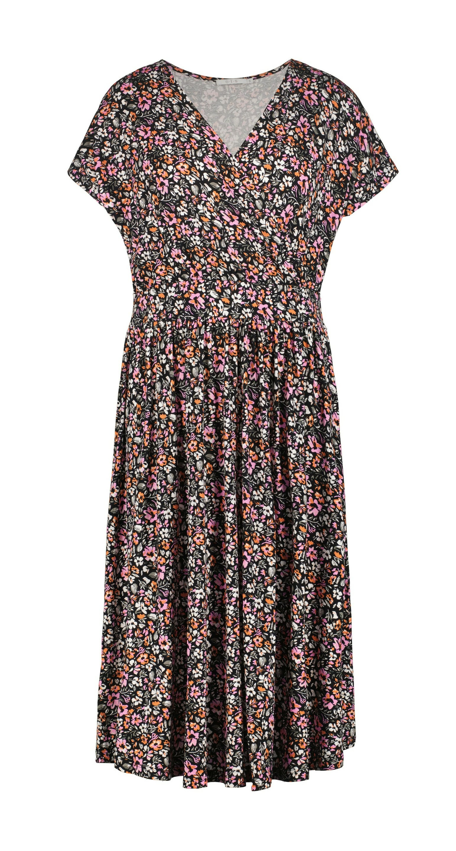 A flower dress with delicate puff sleeves. The upper part of the dress is wrap-style and fitted, and the hem is voluminous with a beautifully gathered waist. The dress has a V-neckline. The material is stretchy, drapes well, and feels pleasant viscose jersey. The back length in size S is 110 cm.