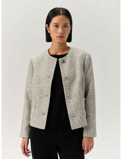 Short and feminine tweed blazer with shiny metal buttons and patch pockets in the front. This Chanel-style collarless blazer features front bust darts and small slits at the cuffs. The material is a soft and sophisticated, peppery cotton blend, and the lining is acetate. The back length is 54 cm in size 36.