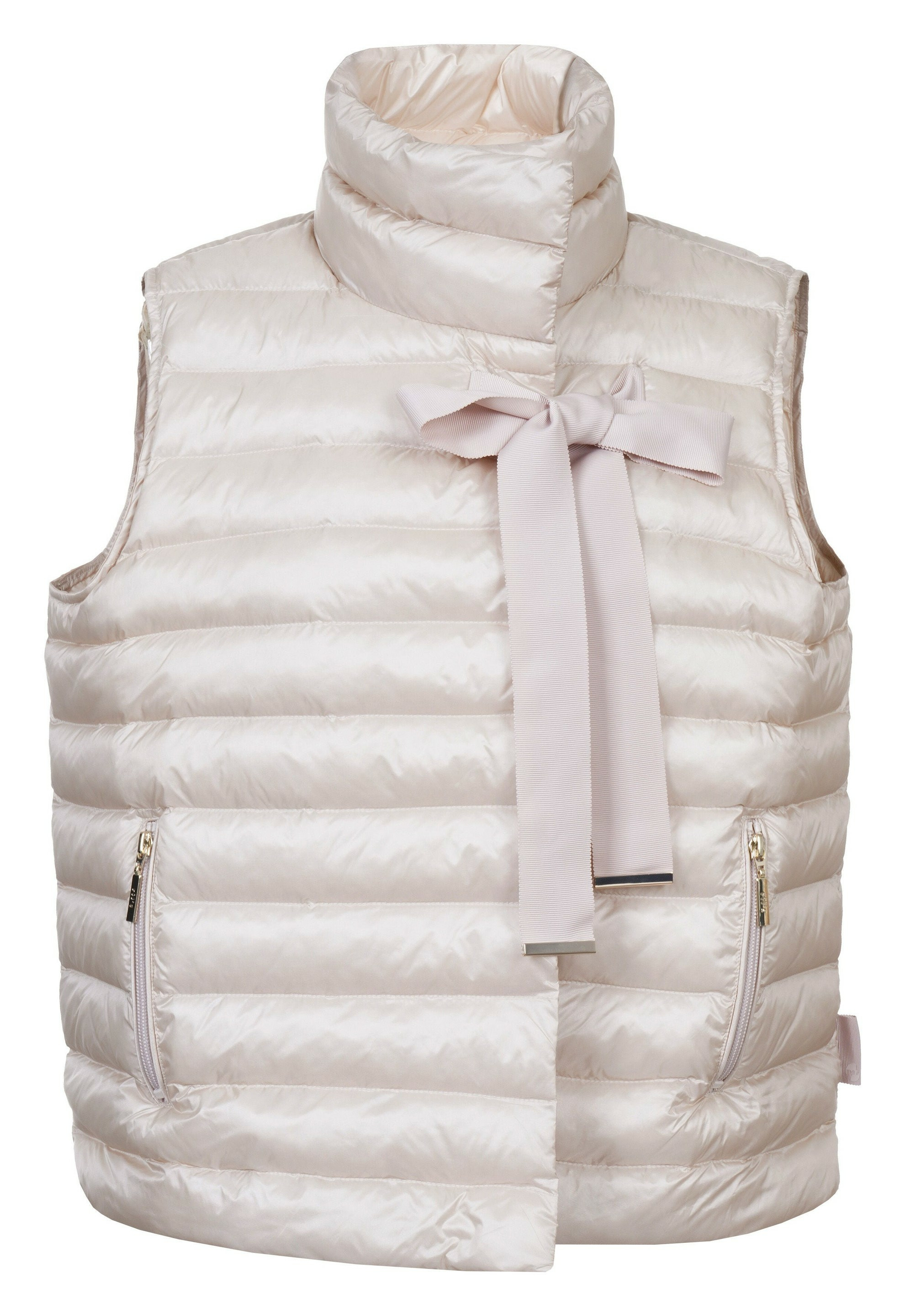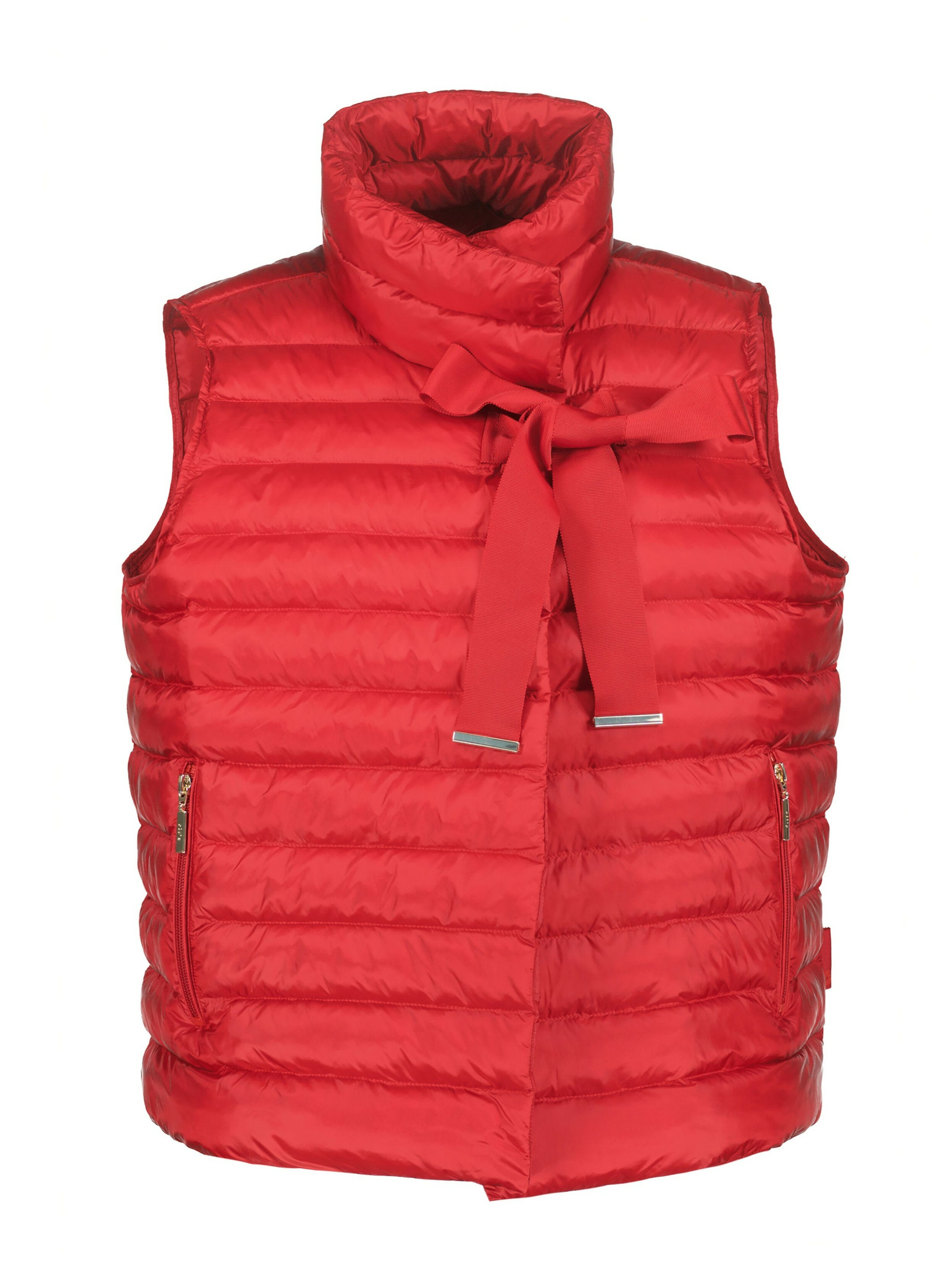 Short puffer vest with a beautiful ribbon as a stunning detail and fastening. The vest features a high stand-up collar, zippered pockets with silver-toned Ril's logo pulls, and small slits on the sides. The plush, down-like quilted outer fabric is made of 100% recycled polyamide that is water-repellent. The filling is high-quality, featherless 3M polyester by Thinsulate. The back length is 54 cm in size 36.