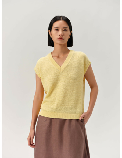 Light, short-sleeved ribbon yarn knit in beautiful bright colors. The material is a lightweight and breathable cotton blend yarn. The back length is 56 cm in size M.