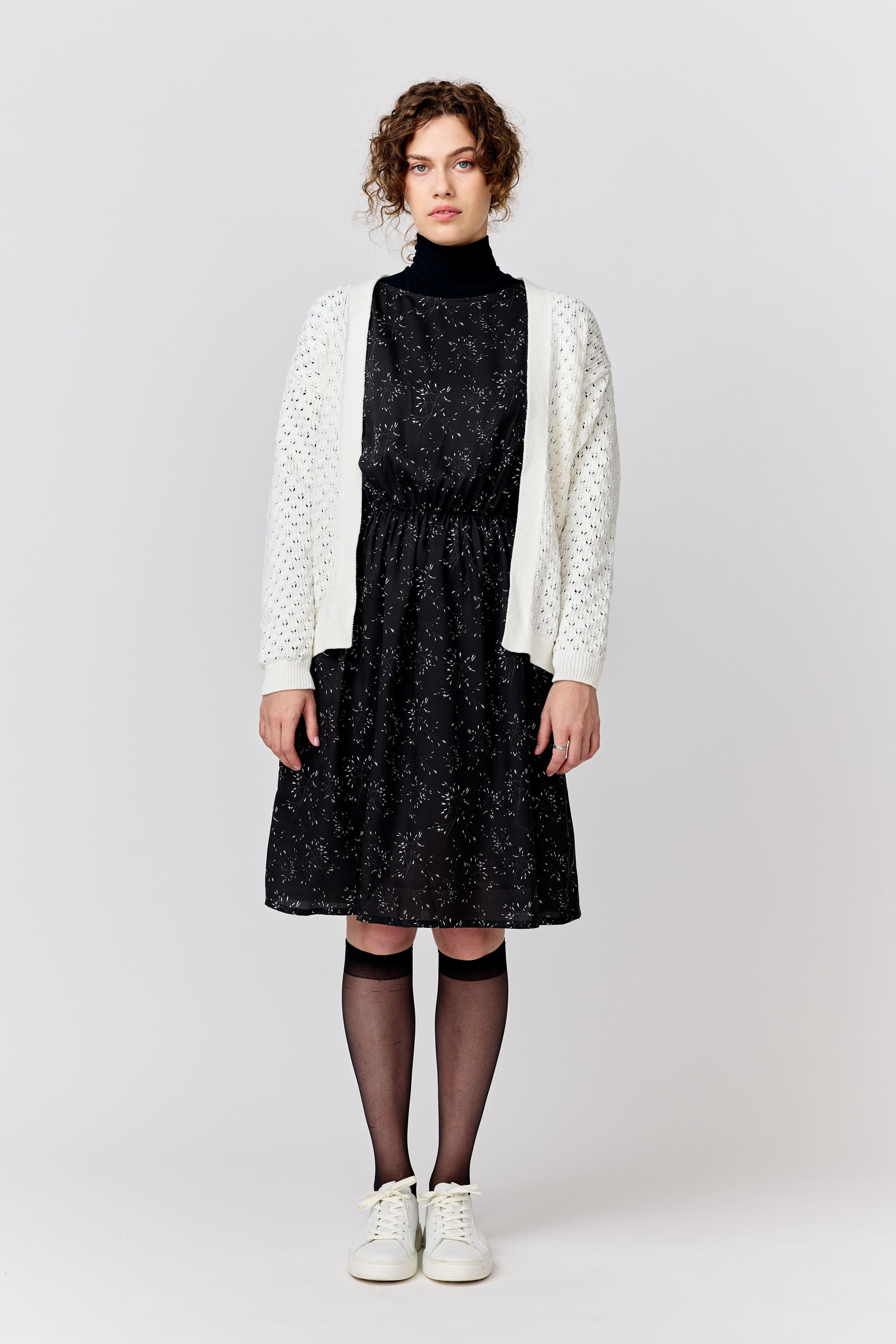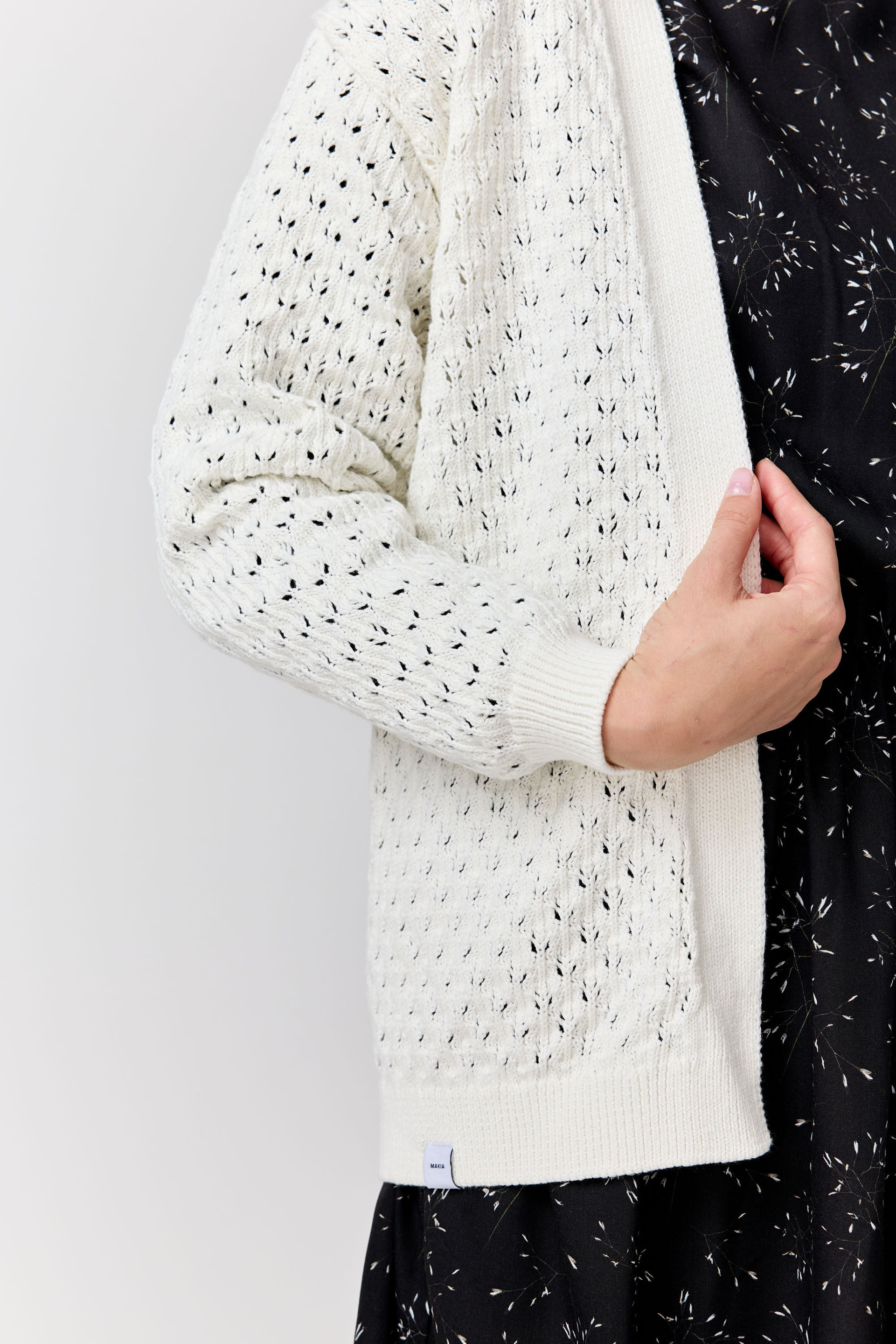 A buttonless ajour-knit cardigan with a regular fit and below-hip length.