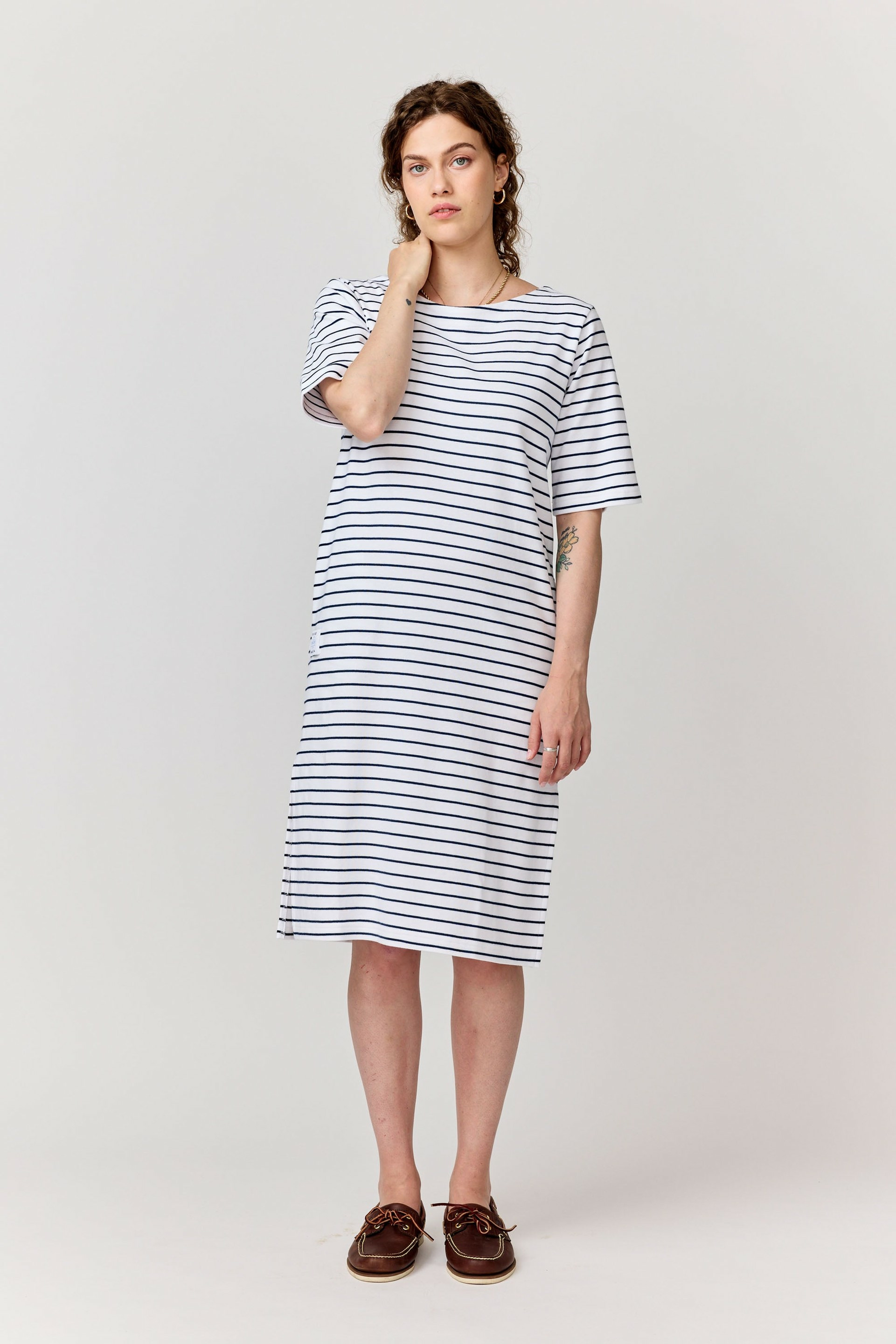 A regular-fitting dress with a boat neck opening and slits on the sides.