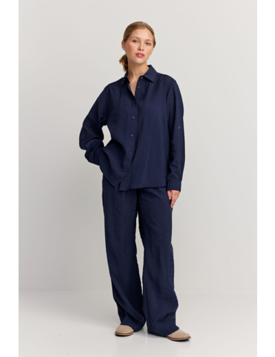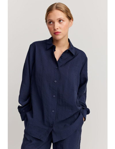 A classic button-up shirt with a relaxed fit. The Hilda Shirt features a rounded hem that’s slightly longer on the back and darts on the chest for a more accented silhouette. Made from modal and polyester.
