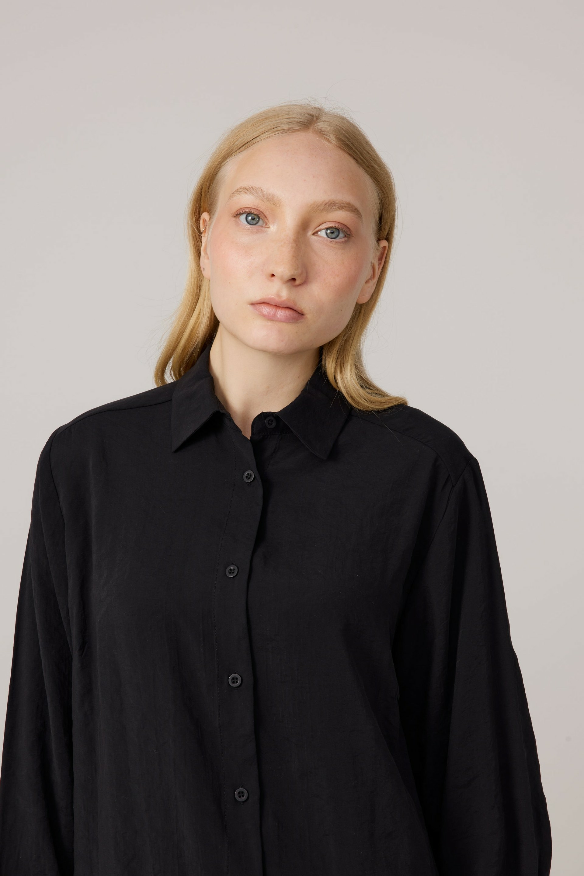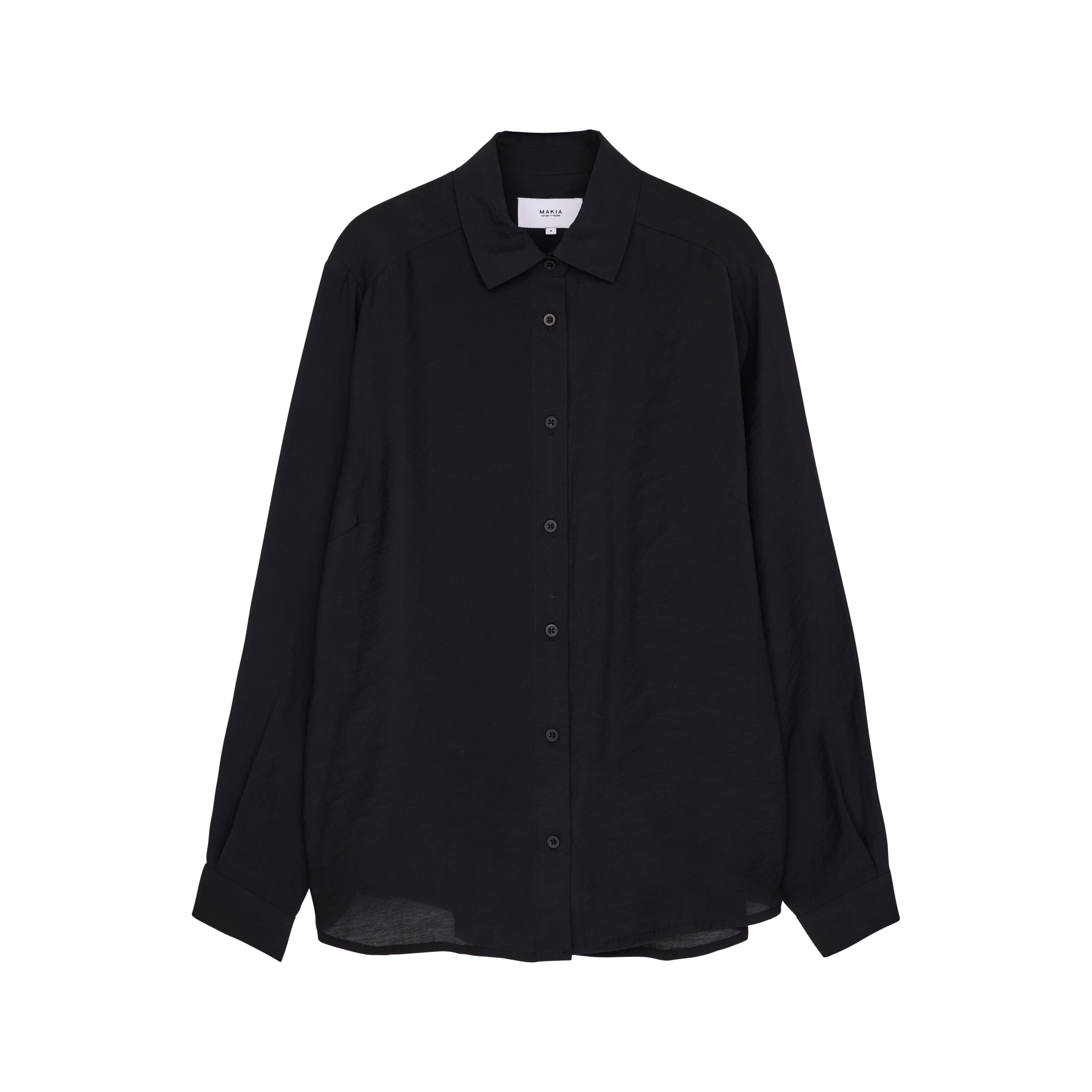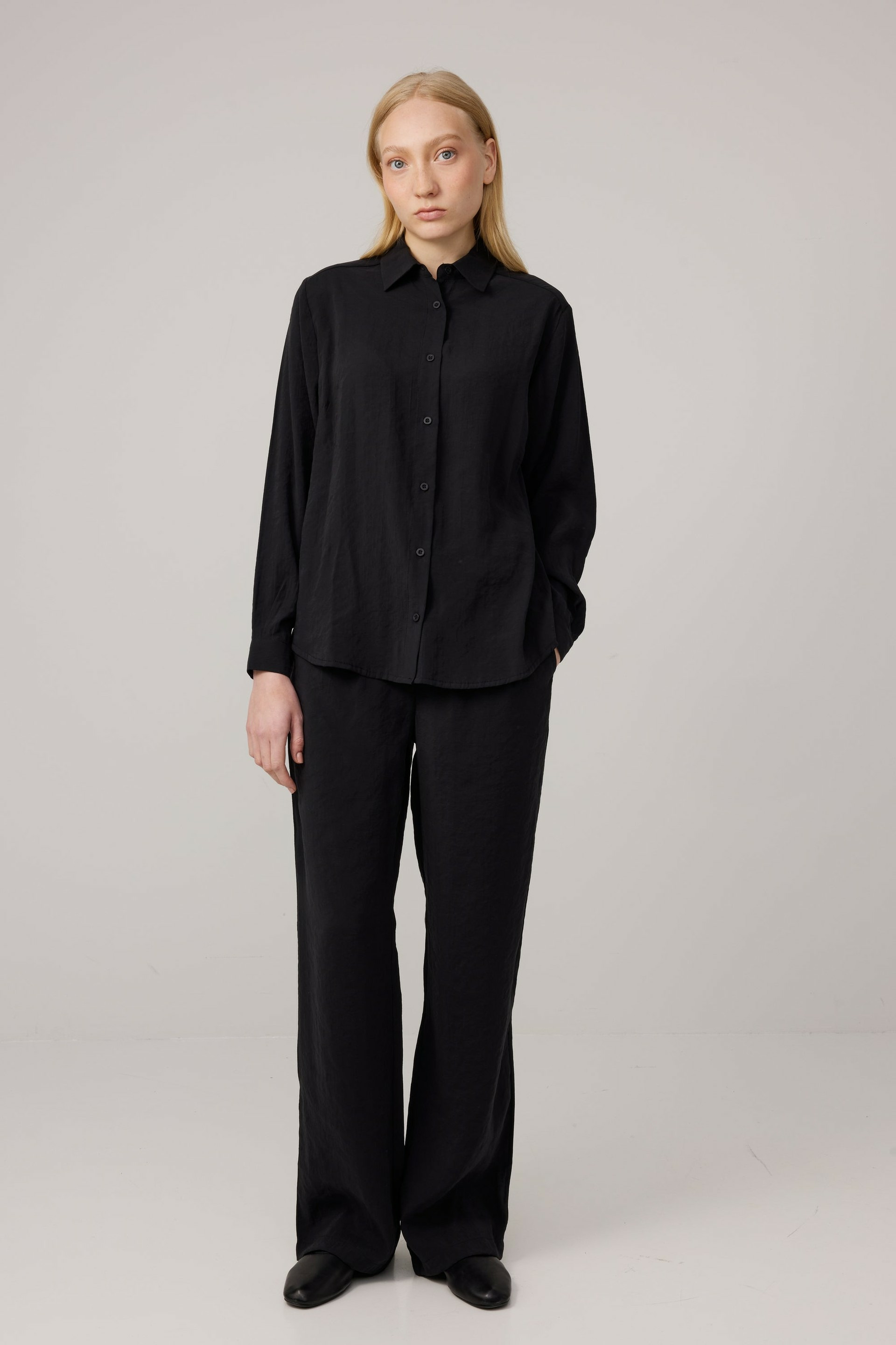 A classic button-up shirt with a relaxed fit. The Hilda Shirt features a rounded hem that’s slightly longer on the back and darts on the chest for a more accented silhouette. Made from modal and polyester.