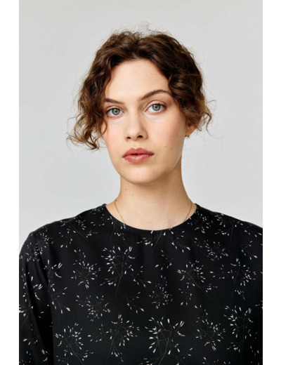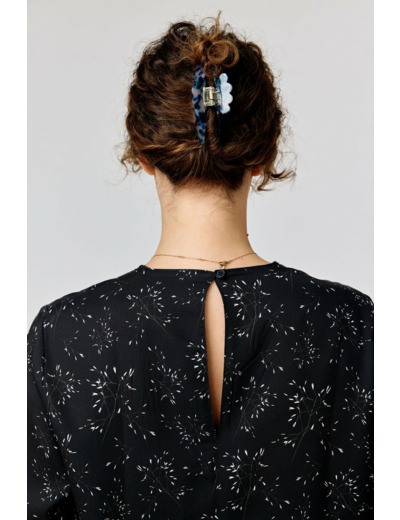 A regular-fitting blouse with a below-hip length. Finished with a back slit with a button closure.