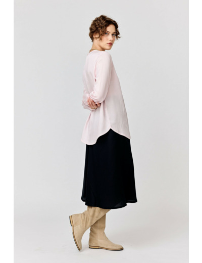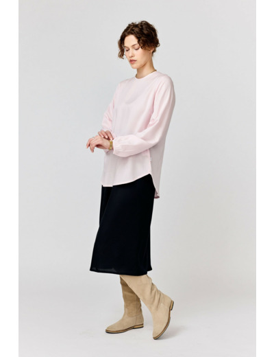 A regular-fitting blouse with a below-hip length. Finished with a back slit with a button closure.