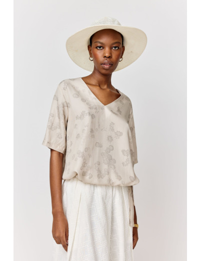 A hip-length blouse with a regular fit. V-neck opening and a belt detail on the waist.