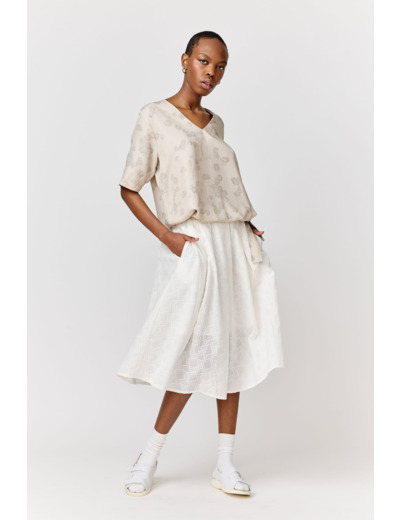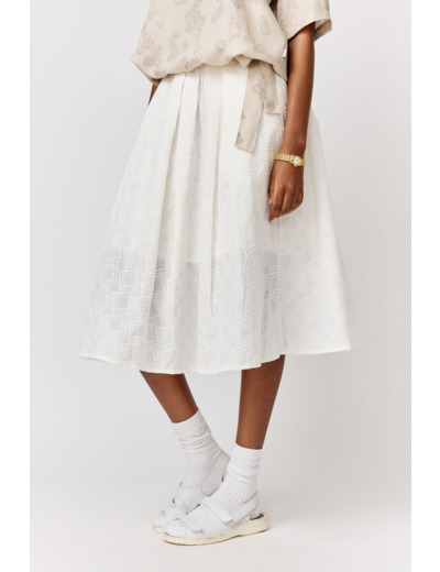 An a-lined midi-length skirt with a regular fit. The Lotte Skirt features an embroidered pattern and pleats around the elastic waist.