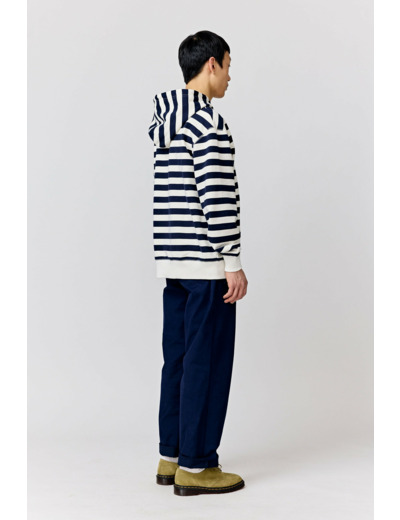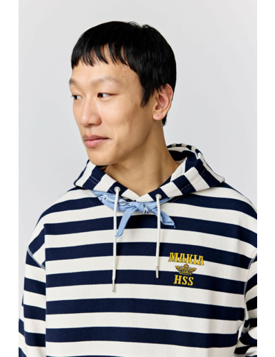 A relaxed-fitting hoodie with a unisex fit. The Starboard Hooded Sweatshirt is made from 100 % organic cotton and finished with stripes and embroidered Makia x HSS logo.