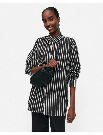 The candy wrapper inspired small Pikku Karla shoulder bag is made of leather with a shoulder strap. The small bag has a zipper closure and a zipper pocket on the inside. The inside lining is made of recycled polyester.