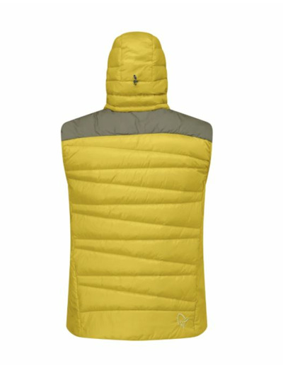 The vest is insulated with high-quality, RDS-certified 750 fill power down (55 g). The sides and collar are equipped with synthetic insulation to reduce heat loss in colder conditions. The shoulder section features a combination of down and recycled synthetic insulation to maintain durability and loft retention in this exposed area.