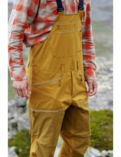 Key features include: Comfortable 38mm elasticated shoulder straps,reduces bulk around the waist, a long, two-way front zip with snap button closure, zippered side venting, back pockets, front pockets, a hidden gaiter hook, an adjustable bottom leg with a lined gusset, belt hoops, and laminated zippers. In addition, the top bib has three zippered pockets and adjustable straps.