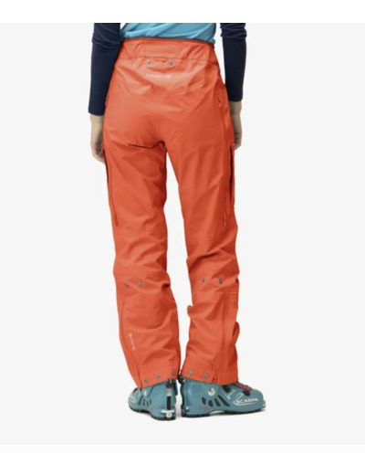 Key features include: A Custom-Fit Waist system for easy customization, side venting from hip to below the knee with two-way zippers, two strategically placed thigh pockets, and a small key pocket. Zipper openings from the lower leg that run up to the boot shaft enable easy width adjustment to accommodate walk and ski modes. Snap tightening under the knee enables tightening around the leg to prevent loose fabric when using crampons, and it has integrated lightweight adjustable snow gaiters.