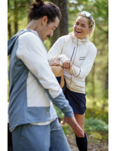 This warm and airy fleece (250g W/M) is perfect to have with you on trail runs with shifting activity levels and temperatures and works great to all activities where you like insulation and partly wind protection in the front and higher breathability in the back.