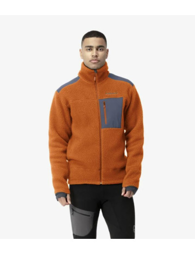 Key features include a zippered chest pocket, two hand warming pockets, elastic cuffs with thumb holes and a warm and weather protective collar.