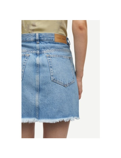 Trendy denim mini skirt with a low waist and raw hem. The skirt features classic five-pocket styling, belt loops, and a front button and zip closure. The light blue wash gives a relaxed, summery look, perfect for both everyday wear and weekends.