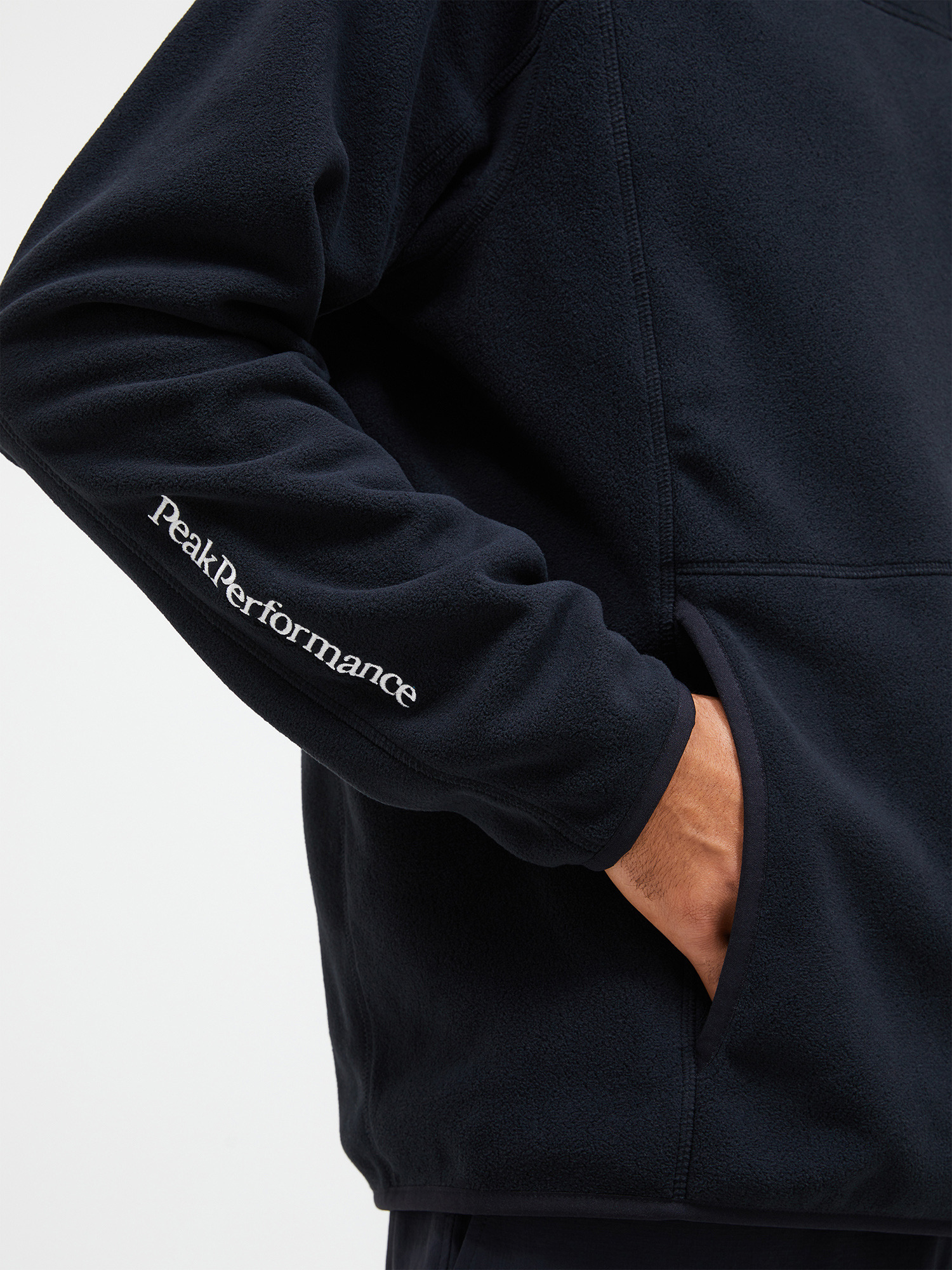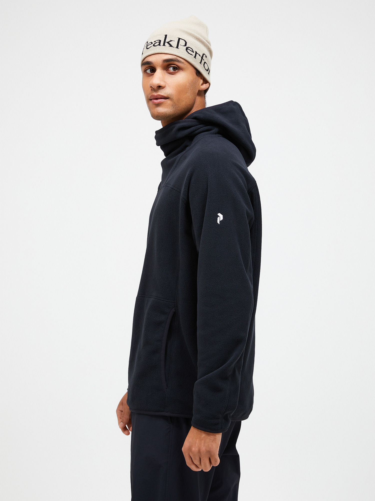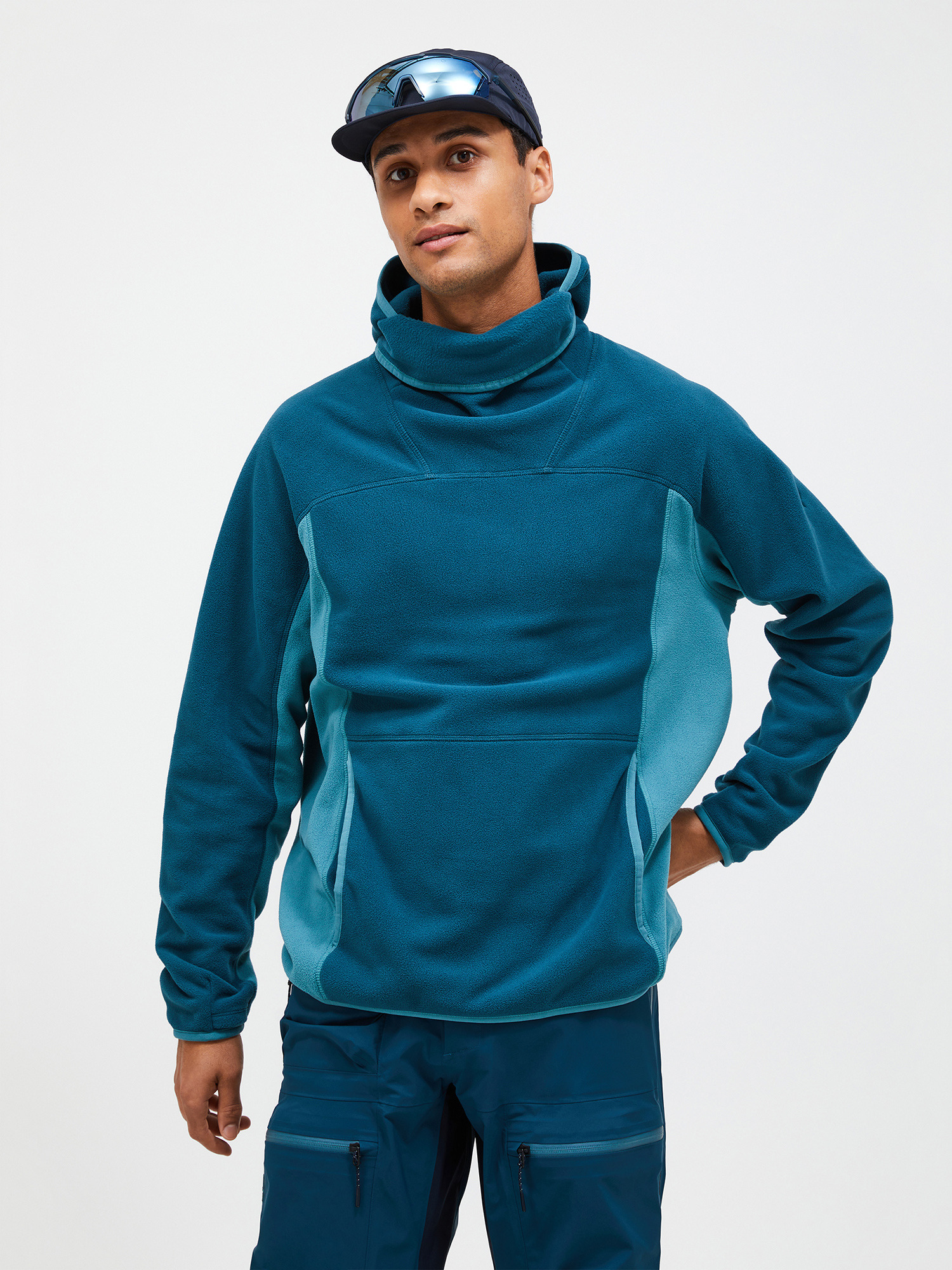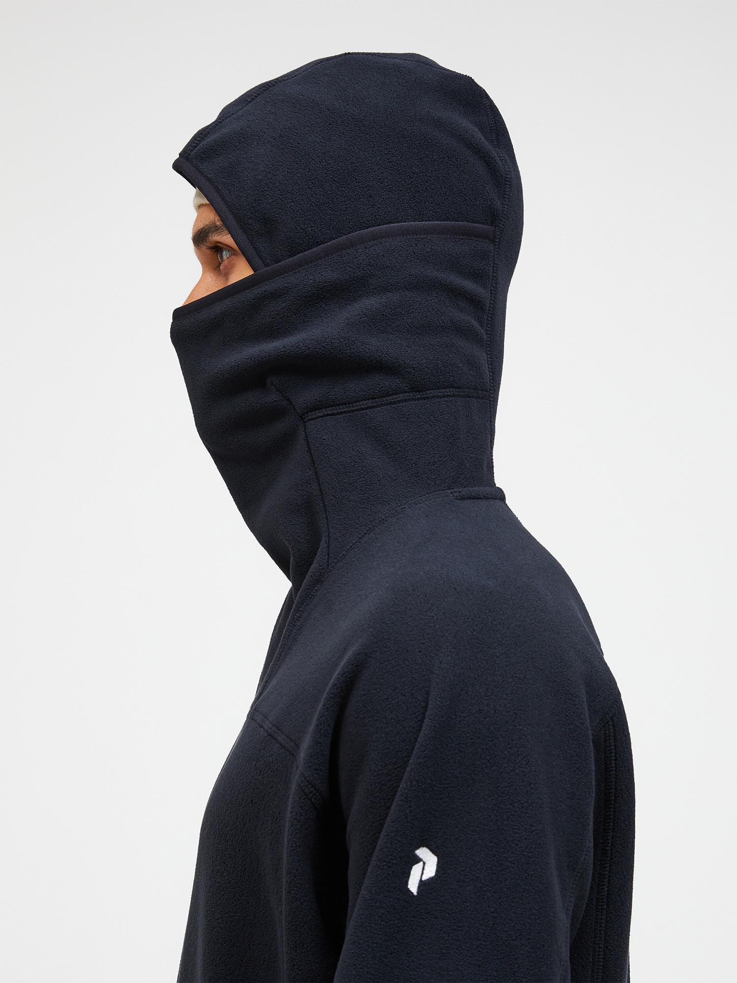 Light fleece hoodie with a balaclava hood, relaxed fit, hand pockets, and thumb holes.