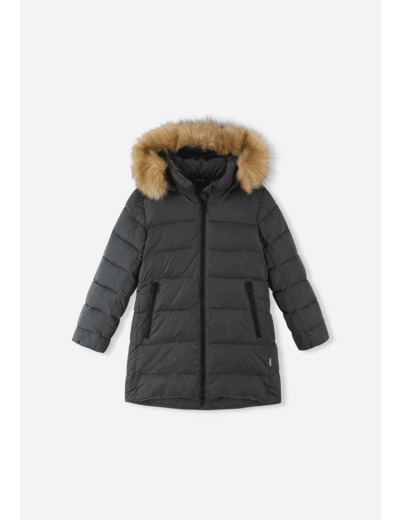 This plush children's puffer jacket is long and features a stylish, detachable faux fur trim on the hood's edge. Made from beautifully shiny material, the winter coat has down-like, recycled fiber padding and a dirt and water-repellent surface – warm and easy to care for! The smooth polyester lining makes it easy to put on. The snap-fastened hood protects against the wind and is also safe for outdoor play: the hood easily detaches if it gets caught on something. The Lunta jacket provides warmth throughout the winter, and when the frost isn't biting, the faux fur trim on the hood can be removed.