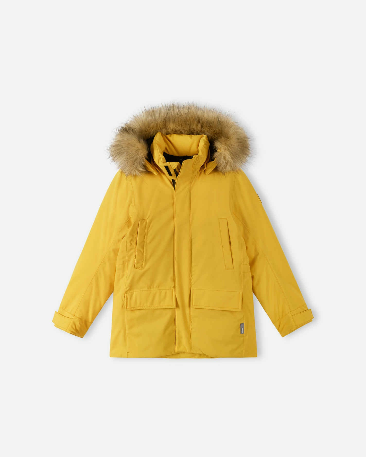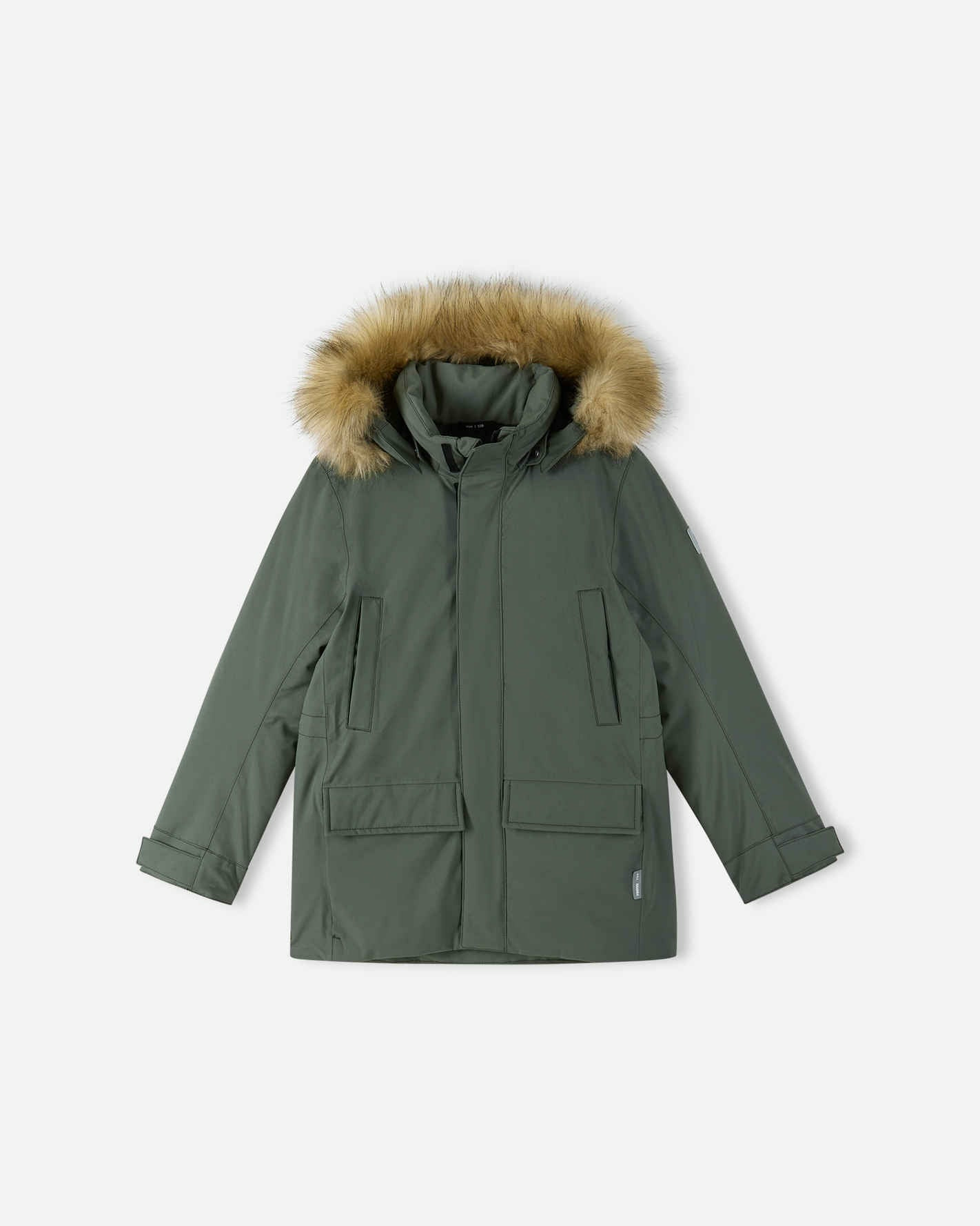 ReimaTec down jacket Serkkula is designed for children's winter adventures. The jacket is made of waterproof and breathable fabric that repels water and dirt. All seams are also taped waterproof, so your child stays dry in any weather. The down insulation of the jacket is exceptionally warm, and the adjustable cuffs keep the wind out. The protective hood, which has a removable faux fur trim, is also safe: the hood detaches if it gets caught on something. The jacket also features a zippered pocket on the side as well as resting pockets and snap-button closure flap pockets in the front. An adjustable waist inside ensures a good fit.