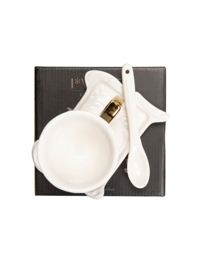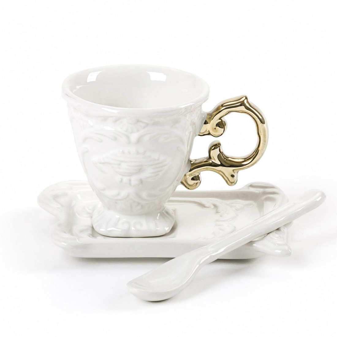 Mugs, tea and coffee sets with a baroque inspiration. Fine opaque porcelain with mat white finishing and fluorescent coloured handles. Brilliant and elegant, the new gold glossy finishing gives to the collection a new sophisticated way of living.